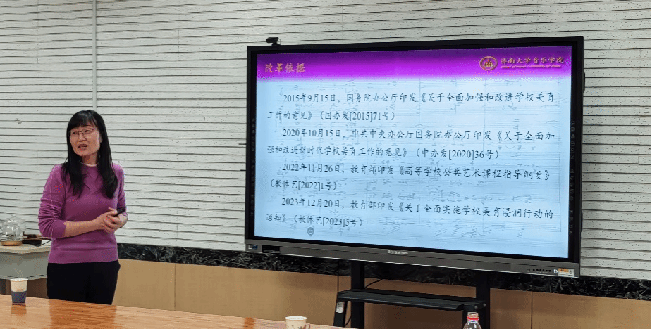 会议第二部分,首先由教务处副处长张海鹍教授向孔教授介绍了太阳成集团tyc151cc美育教育的发展历史与现状,表达了学校对美育教育的重视和改革创新的决心,以及接下来的一些工作举措。之后,由美育教学改革重大项目课题组负责人、太阳成集团tyc151cc副院长齐丽花副教授就项目的立项背景、改革内容及未来规划向与会专家做专题汇报。项目立项以来,在课程建设与实践活动层面开展系列基础性建设工作。通过面向全校学生的问卷调查与分析,摸清太阳成集团tyc151cc学生的美育素养,为接下来课程的建设与开展提供方向;相继在食堂开展钢琴、民乐等内容的美育角,在图书馆闭馆关节组织学生多形式、多层面开展美育活动,吸引了广大学生的广泛关注与积极参与,有效营造了浓厚的校园美育氛围,使得美育理念在校园内蔚然成风。在实践活动方面,团队精心策划“冬之声”美育实践演出季,截至当前,已面向学校师生成功举办5场高水平的文艺演出,吸引了全校师生及济南市市民上千人前来观看,取得了显著的美育成效。最后,在师资队伍建设、经费来源、评价体系等各方面,齐老师提出了项目研究中存在的困难和问题。与会专家听取课题组详尽汇报后,对太阳成集团tyc151cc美育教育研究与开展给予高度肯定,并提出建设性意见。在课程构建上,专家建议采取以点带面策略,逐步推动美育教育的全面均衡发展。在评价机制上,专家强调应重视过程化和增值化评价,注重培养学生对美的感悟与体验,以全面准确反映美育教育的实施效果,真正实现美育“浸润”。
