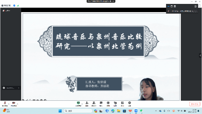 其次,在分会场我院四位硕士研究生进行线下发言。2023级音乐教育方向研究生蔡依檀对其论文《音乐在“南洋”海上丝绸之路经济交流中的角色与影响》进行讲解,论述音乐在海上丝绸之路经济交流中扮演了促进贸易、加强文化交流和增进相互理解的角色。2022级音乐教育方向研究生王子仪以钢琴改编曲《走马随想曲》的演奏技巧与音乐诠释为切入点,分析与归纳传统音乐古谱与钢琴音乐的共通点,探索更多民族元素运用于我国海上丝绸之路钢琴音乐创作的有效路径。2023级音乐教育方向研究生李泽华以扬琴与钢琴的音乐碰撞及融合为主要创新点,探讨扬琴元素在钢琴改编音乐中的运用,如何用不同的创作技法呈现多元民族乐器的音色与技巧,探索中西音乐融合的有效路径,彰显民族音乐文化在钢琴演奏中的实践价值。最后2023级音乐教育方向研究生郭春丽以海上丝绸之路音乐文化交流与福建南音三弦的共生与发展为论文题目,从福建南音与其它国家的历史渊源,以及福建南音三弦在日本的传承发展进行阐述。