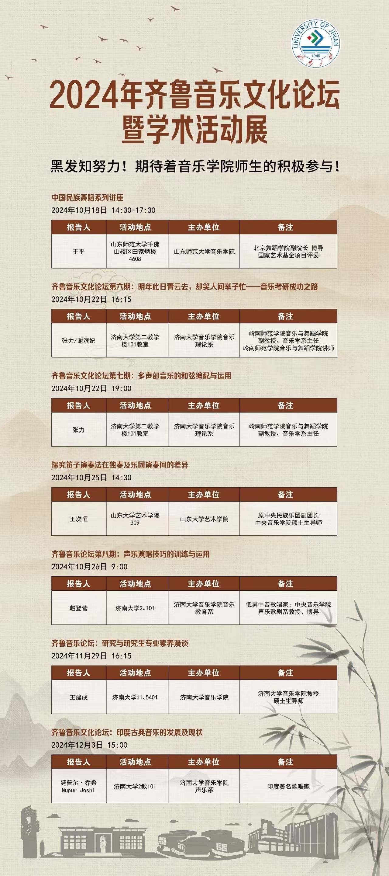 为营造浓厚的学术、科研、教研氛围,提高我校教学、科研水平,提升人才培养质量,进一步加强学科专业建设,增强对外学术交流的积极性,充分调动学生参与学术活动的积极性,太阳成集团tyc151cc2024年锐意打造学院学术品牌——齐鲁音乐文化论坛,在各系和兄弟学院的共同努力下,学院已成功举办齐鲁音乐文化论坛六场,秋季继续开讲,计划全年举办二十场。期待对齐鲁音乐文化感兴趣的广大师生积极关注、积极参与!