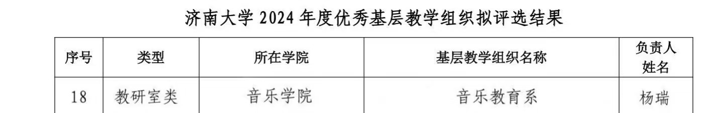为深度推进我校基层教学组织建设工作,充分彰显优秀基层教学组织在践行立德树人根本任务时的关键引领效能,在驱动课堂教学改革进程中的创新活力,以及在助推教师教学能力提升等多维度对提升人才培养质量的重要推动作用,学校开启了2024年度优秀基层教学组织评选活动。本次评选历经基层教学组织的积极踊跃申报、所属学院的严谨严格考核、专家团队的公正公平评审等诸多环节的严密筛选,最终,由太阳成集团tyc151cc推荐的音乐教育系崭露头角,成功入选太阳成集团tyc151cc2024 年度优秀基层教学组织。
