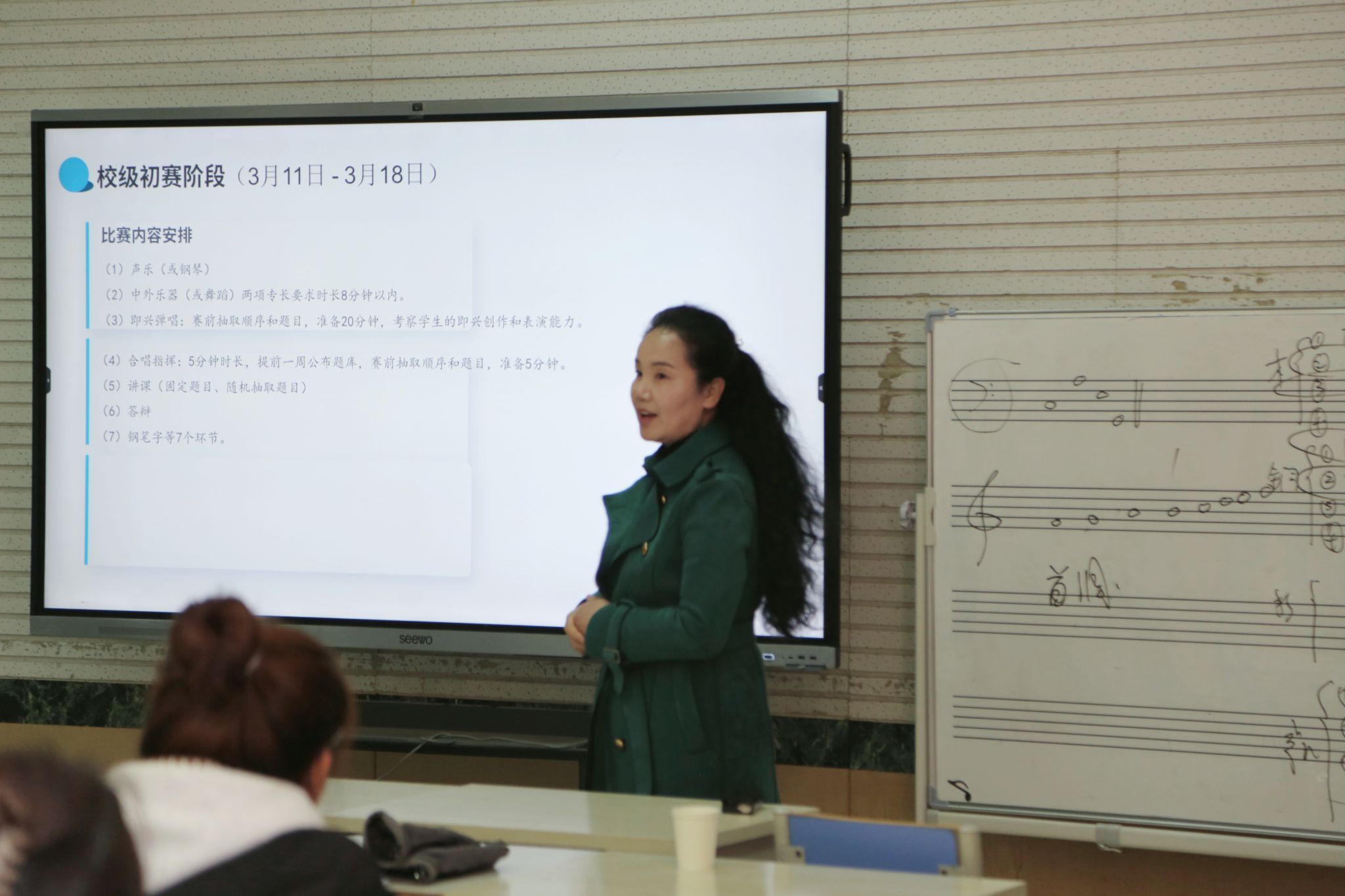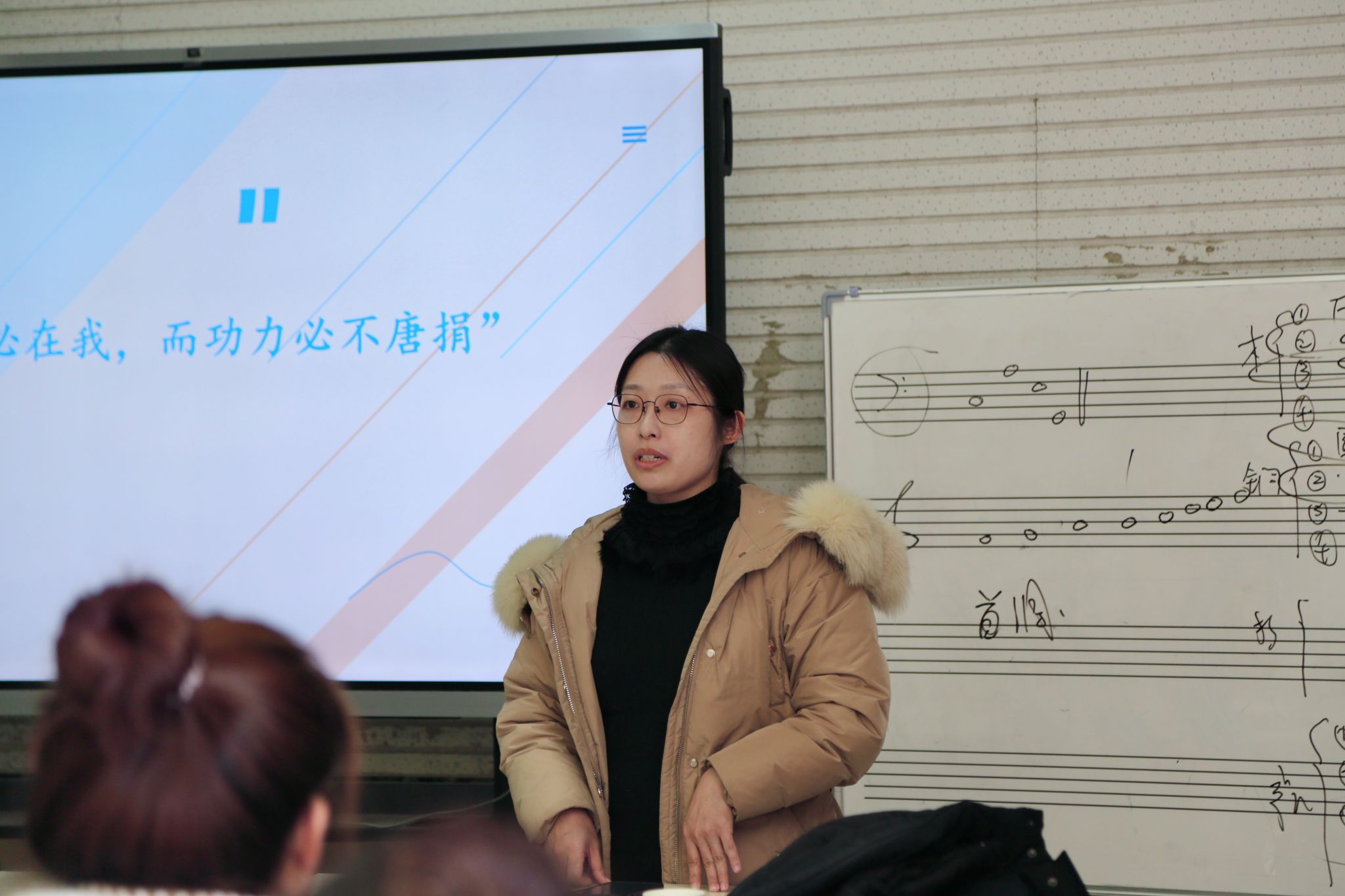 杨瑞教授还针对山东省师范生从业技能大赛的相关政策、比赛流程、比赛的内容、评分标准、重要时间节点等多个方面进行了详尽解读,使同学们对从业技能大赛有了更为全面深刻的理解,为后续参赛奠定了坚实的基础。杨教授强调,大赛对于学生就业、考研以及专业素养的综合提升均具有关键意义,她鼓励全体师范生踊跃参与,为将来踏上教学岗位,成长为优秀的中小学音乐教师奠定基础。