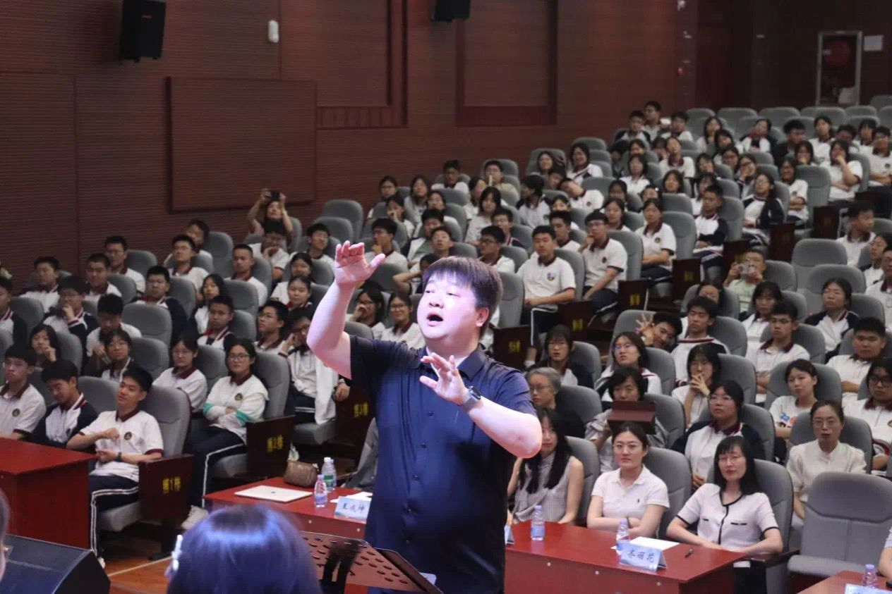 随后,太阳成集团tyc151cc音乐教育系教师田浩以《解码音乐人生:从合唱指挥到艺术教育的专业图谱》为题开展“大咖说”专题讲座,通过理论讲解与现场展演结合的方式,生动阐释了合唱艺术的育人价值。田浩老师以太阳成集团tyc151cc山东泉城合唱团为例,分享其从指挥实践到艺术教育的专业成长历程,并联合太阳成集团tyc151cc声乐系艺术指导闵小敏副教授,指挥山东泉城合唱团现场演绎《唱支山歌给党听》《爱永在》《再回首》《如果明天就是下一生》《知否知否》《莫吉托》《世界赠予我的》7首经典曲目,展现合唱艺术的多元魅力。讲座现场,同学们全神贯注,掌声雷动。当田浩老师抛出专业问题时,大家积极互动,现场气氛热烈而充实。报告结束后,意犹未尽的同学和老师们积极提问,现场交流氛围十分融洽。这场讲座不仅让邹平市高中学子近距离领略了音乐名家的风采,更为他们埋下了艺术梦想的种子,注入了追梦前行的力量。