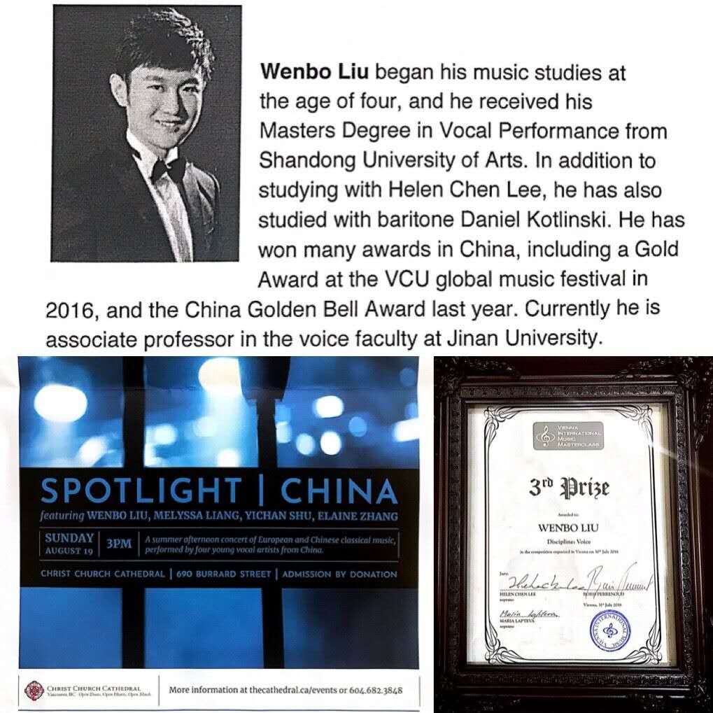 维也纳国际声乐比赛是目前世界上众多声乐比赛中非常具有影响力的国际声乐比赛之一,也是发现年轻歌唱人才、推动各国青年歌唱家进行交流的一个重要平台。本次比赛约300余名世界各国的青年艺术家及专业院校的师生参加了今年声乐比赛的预选赛,其中来自奥地利、意大利、美国、德国、加拿大、中国、韩国、日本等十几个国家的60多名男女选手获得了到维也纳参加决赛的资格。西方媒体报道中说到“刘文博先生音色纯净、丰满、明亮,舞台表演带有朴实的自然美感。”他演唱的外国作品严谨准确,驾驭作品圆润而富于穿透力,尤其是他演唱的几首中国古诗词,不仅让外国观众感受到中国音乐的魅力和神奇,更被中国的传统文化再次震撼。