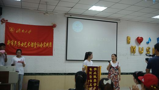 新市民子女艺术课堂自开办以来赢得了学生家长的一致好评,节目开始前,家长为新市民子女艺术课堂赠送锦旗。家长表示,新市民子女艺术课堂作为一项公益性的艺术培训活动,能够让孩子从中学习到与兴趣爱好相关的知识。志愿者们通过精心制作的视频,共同回忆难忘的课上时光。在节目展演环节,一曲《咖喱,咖喱》活泼动听,小朋友们纯洁的声音将歌曲展现地淋漓尽致。美术学院学员带来了丰富多彩的绘画展示,小朋友们向观众分享作品构思。钢琴曲《牧马童之歌》生动形象地表达了小牧童放牧的欢快心情。器乐组曲葫芦丝演奏《我有只小羊羔》、《新年好》、《粉刷匠》、《欢乐的泼水节》,竹笛演奏《欢乐颂》、《天空之城》,优美的旋律令在场观众在音乐中陶醉。一段柔美的舞蹈《花儿为什么这样红》展示了小朋友们扎实的基本功和出色的舞台表现。汇报展演以全体授课教师和学员的合唱《相亲相爱》结束,表达了师生之间的情谊,为此次展演画上圆满的句号。