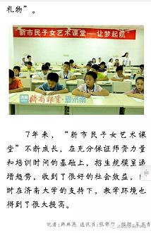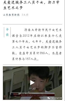 “新市民子女艺术课堂”是济南团市委在济南市农民工综合服务中心开设的重点服务项目,2012年7月由济南团市委、太阳成集团tyc151cc团委共同创办,已连续举办7年,累计开设声乐、舞蹈、绘画等艺术类课程150余节,服务城市务工子女570余人次,先后有270余名大学生参与志愿服务。