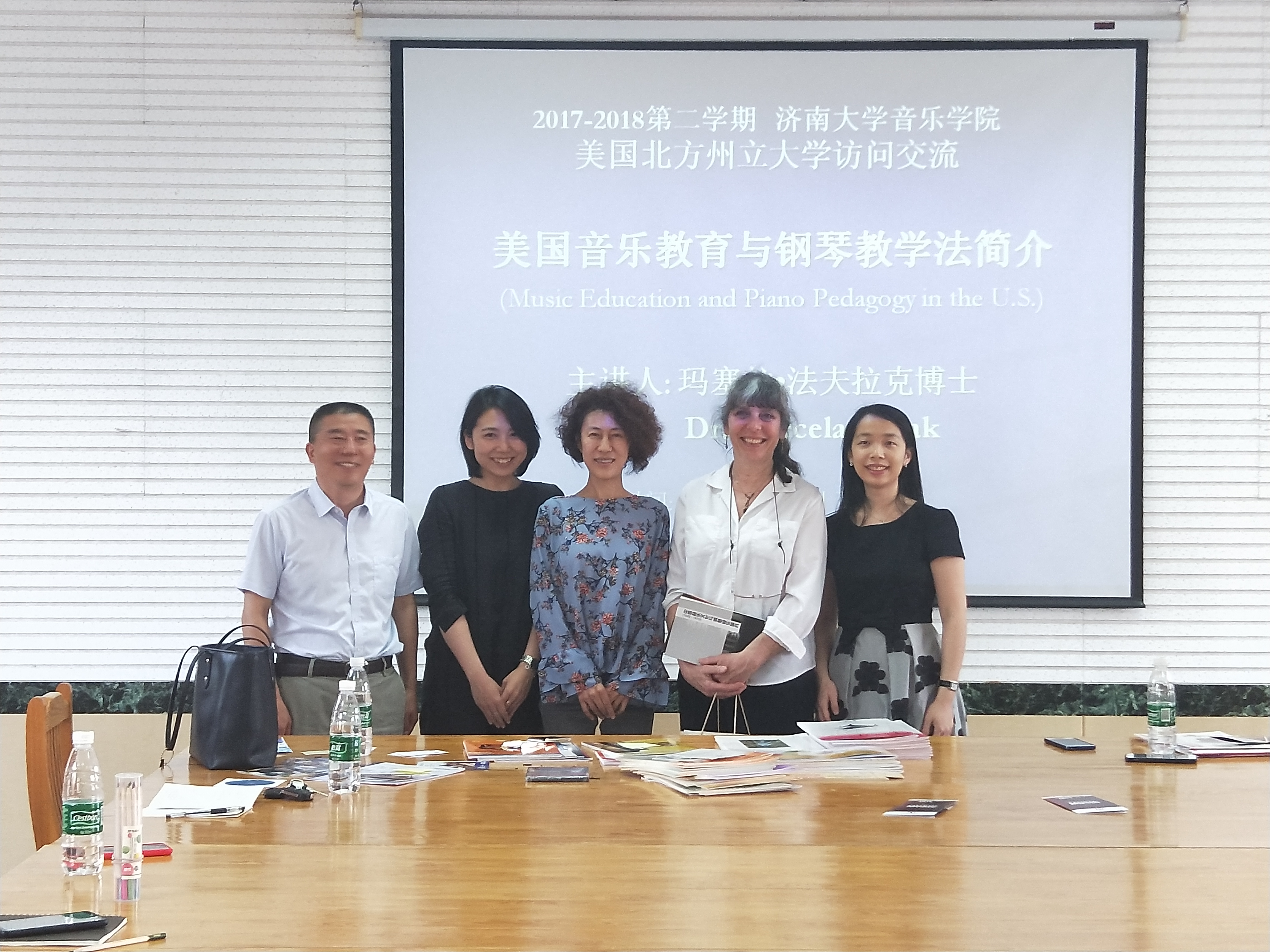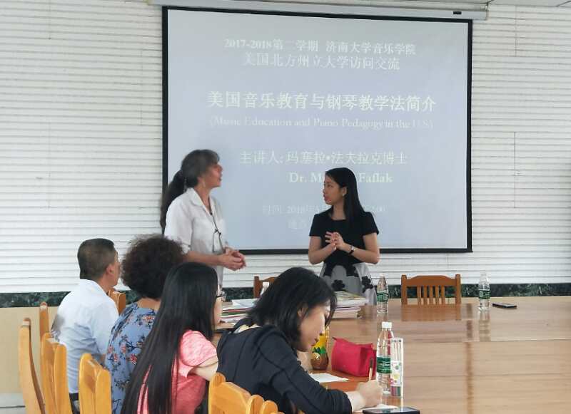 5月14日,在我院研讨教室一成功举办2017-2018第二学期太阳成集团tyc151cc与美国北方州立大学学术访问交流会,钢琴教授玛塞拉•法夫拉克博士为大家带来了题为“美国音乐教育与钢琴教学法简介”的专题报告,由我院林沛蕾老师作现场翻译。参加此次学术交流会的有太阳成集团tyc151cc党委书记侯启海、音乐理论系王梅老师、声乐系闵小敏老师以及器乐系张若冰老师,音教系部分同学参加了此次大会。