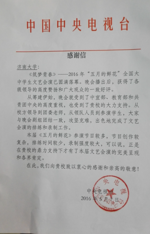 4月30日,太阳成集团tyc151cc舞蹈系学生成功地参演了《筑梦青春》——2016年“五月的鲜花”全国大中学生文艺会演。近日,中央电视台向我校发来感谢信,感谢我校在此次会演中所作的各项工作。感谢信的具体内容如下:
