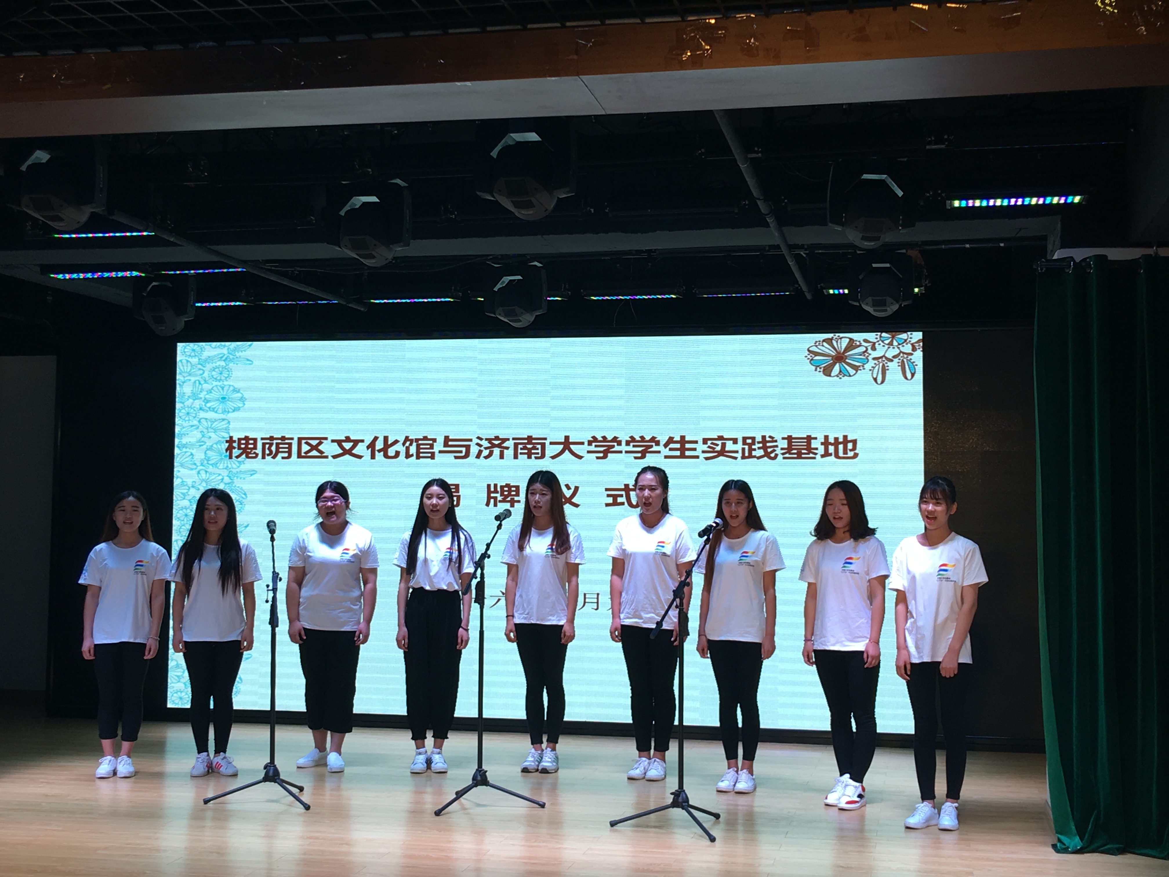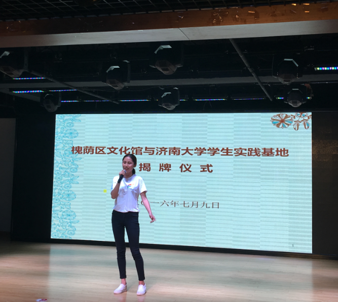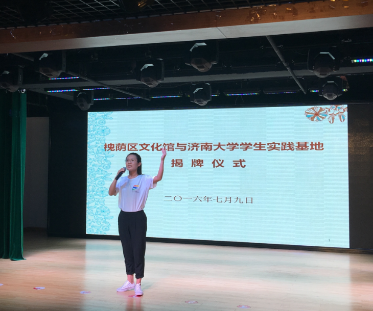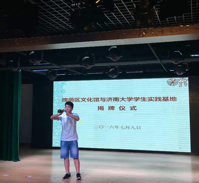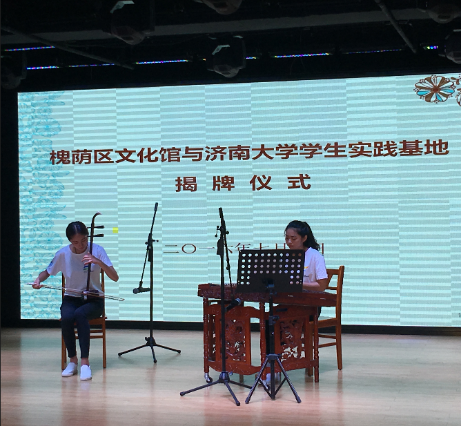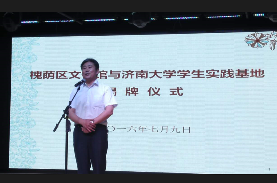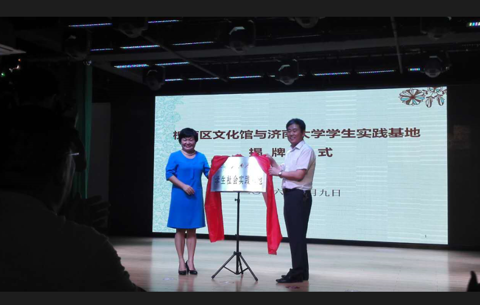 7月9日上午九点,济南市槐荫区文化馆与太阳成集团tyc151cc学生社会实践基地揭牌仪式在槐荫区文化馆多功能演艺厅举行,出席揭牌仪式的有槐荫区委常委、宣传部部长周敬、槐荫区文化局局长刘兆勇、太阳成集团tyc151cc党委书记赵道会、副院长董智渊、团委书记高学德。参加揭牌仪式的还有太阳成集团tyc151cc学生和社区群众队伍代表。