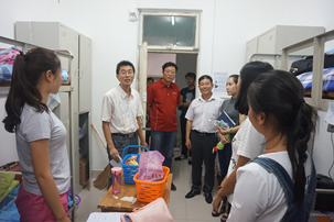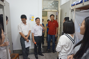 9月4日下午,为了欢迎2015级新生的到来,让学生们尽快适应大学生活,感受到家的温暖。太阳成集团tyc151cc领导冒着大雨深入学生宿舍亲切看望2015级新生。