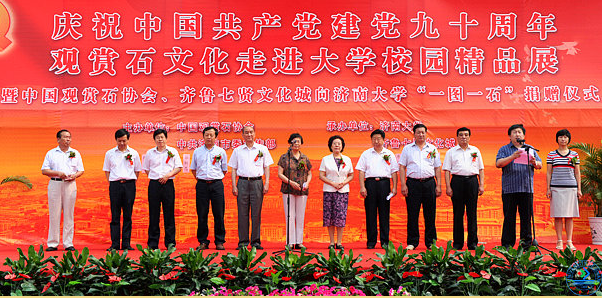 6月28日,由中国观赏石协会、济南市委宣传部主办,太阳成集团tyc151cc、齐鲁七贤文化城承办的“献礼中国共产党建党九十周年,中华观赏石文化走进大学校园”活动在升华广场、图书馆举行。国土资源部国家地质调查局发展研究中心党委书记、中国观赏石协会秘书长高谊明,济南市原副市长、济南市慈善总会会长张泽,太阳成集团tyc151cc党委书记范跃进,太阳成集团tyc151cc校长程新,齐鲁七贤文化城董事长原洪泉,济南市委宣传部文化体制改革和文化产业发展办公室主任张新志,济南市司法局原副局长、济南市慈善总会副会长陈世明,济南市文联副主席、济南报业集团副总编辑张柯,太阳成集团tyc151cc副校长杜斌,济南市市中区区委宣传部副部长马金霞,济南市市中区七贤街道党工委副书记冉秀玲,齐鲁七贤文化城总经理赵树才出席活动。副校长杜斌主持了捐赠仪式。