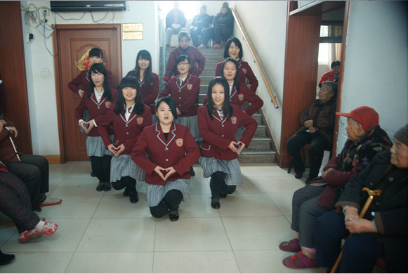 进入敬老院,学生们立即忙开了。有的帮爷爷奶奶打扫屋子,叠被子,有的陪爷爷奶奶按摩、聊天。敬老院顿时热闹起来。门口大厅小小的空间成为了同学们的临时演艺厅,学生们为爷爷奶奶精心准备的各种节目拉开了帷幕。各种舞蹈、男女生独唱、合唱等形式多样的节目呈现在大家眼前,两位同学演唱的吕剧《点着了炉中火》声情并茂,老人们非常喜爱。在歌曲《甜蜜蜜》演唱中,很多老人随着熟悉的旋律附和起来。同学与老人的互动将整个演出推入高潮,老人们的气氛在一曲曲优美的歌声中越来越高涨,学生们也越来越活跃。优美的音符充溢着每一个角落,温暖与幸福包裹着整个敬老院。夜色渐入,学生们只能与老人们挥手告别,一位老奶奶握着学生的手不断地说:“你们一定要再来看我啊!”同学们开心允诺,让温情在寒冬延续。