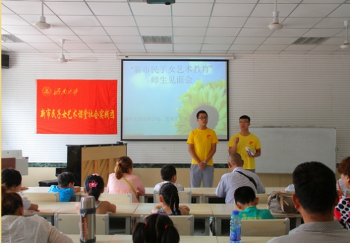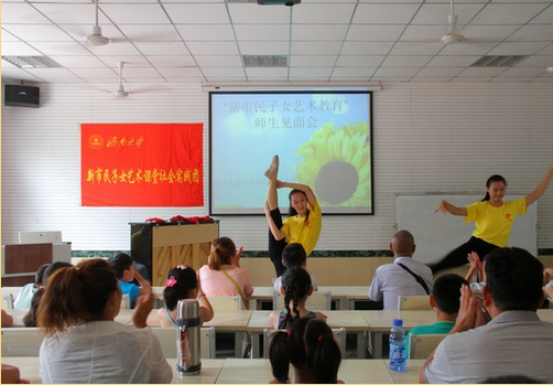 为了给学生留一个好印象,上午八时,太阳成集团tyc151cc的志愿者们就来到学院多媒体教室开始了师生见面会的准备工作。见面会由太阳成集团tyc151cc新市民子女艺术课堂队长负责人主持。会议首先为家长和孩子们讲述了“新市民子女艺术课堂”的办学意义以及授课课日程安排。接下来由各位授课老师分别为家长和孩子们展示自己的才艺。民族舞授课老师给大家展示了扇子的合展与身体的扭转动作,接下来的踢腿、搬腿、大跳等基本功瞬间征服了家长和孩子们的心。器乐老师则用琵琶、二胡、萧给大家合奏了《还珠格格》主题曲《当》,节奏鲜明,曲调悦耳,很多孩子和家长都跟着音乐哼唱。伴着《爸爸去哪儿》的旋律,四位声乐老师走上台,带领孩子们一起演唱了歌曲,现场洋溢着孩子们欢乐的歌声和家长的热烈的鼓掌声。