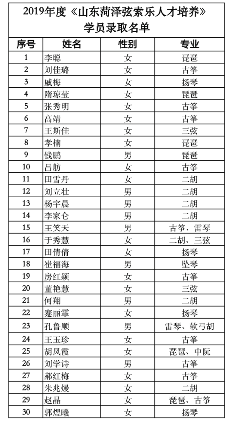 《山东菏泽弦索乐表演人才培养》招生工作已经基本结束,经过专家团队的筛选、评比,现将结果公布如下: