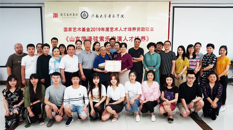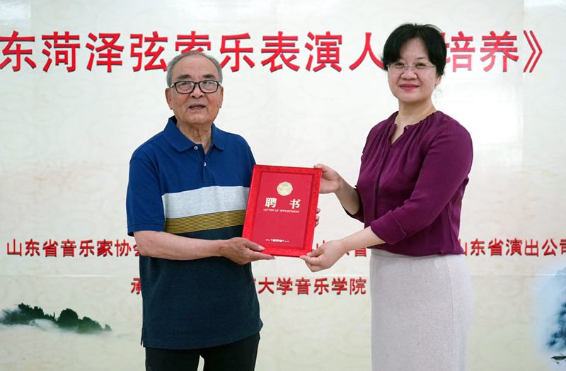 6月8日上午,87岁高龄的国家级非遗传承人、民族器乐演奏家、作曲家、教育家、国家一级演奏员赵登山客座教授聘任仪式在我校举行,太阳成集团tyc151cc李光红副校长为其颁发聘书,国家艺术基金2019年度艺术人才培养资助项目《山东菏泽弦索乐表演人才培养》项目学员、太阳成集团tyc151cc部分师生共同参加了仪式。
