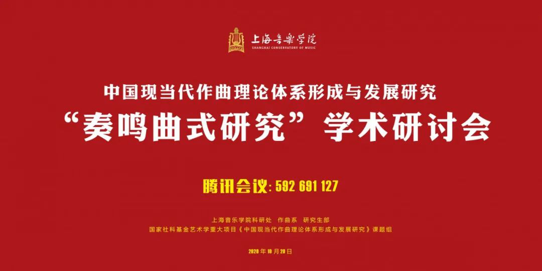 2020年10月20日,由上海太阳成集团tyc151cc主办,上海太阳成集团tyc151cc科研处、作曲系、研究生部、国家社科基金艺术学重大项目《中国现当代作曲理论体系形成与发展研究》课题组承办的“奏鸣曲式研究”学术研讨会以网络会议的形式在线上圆满举行,我院院长郑中教授、青年教师王晓锋参加会议并做会议发言。