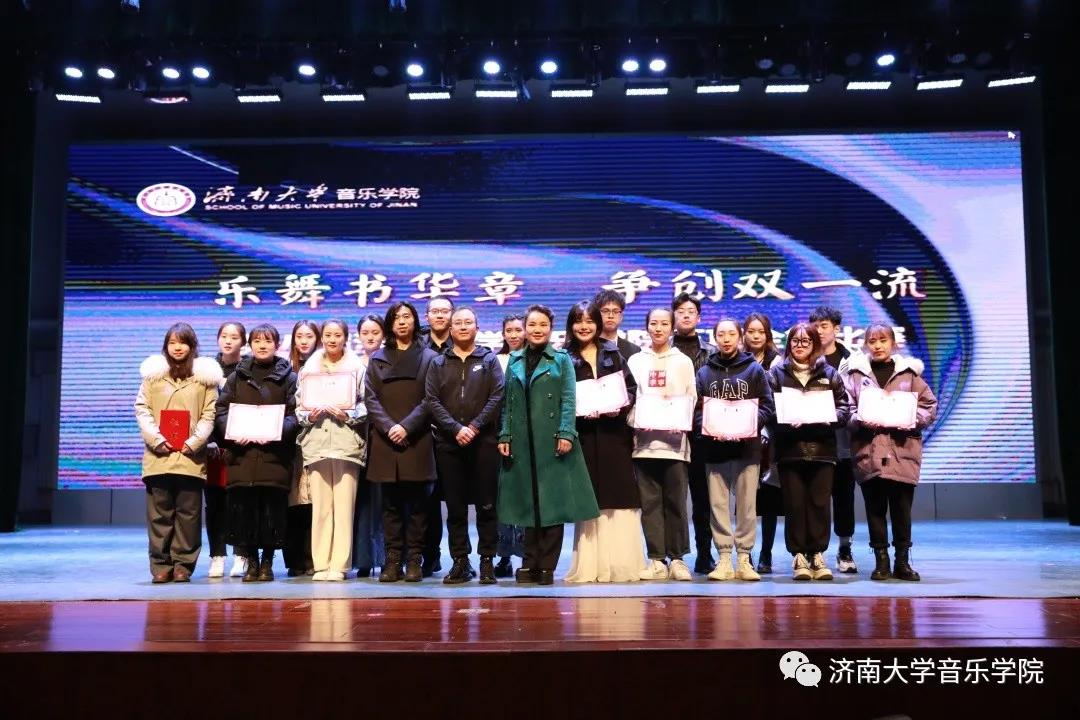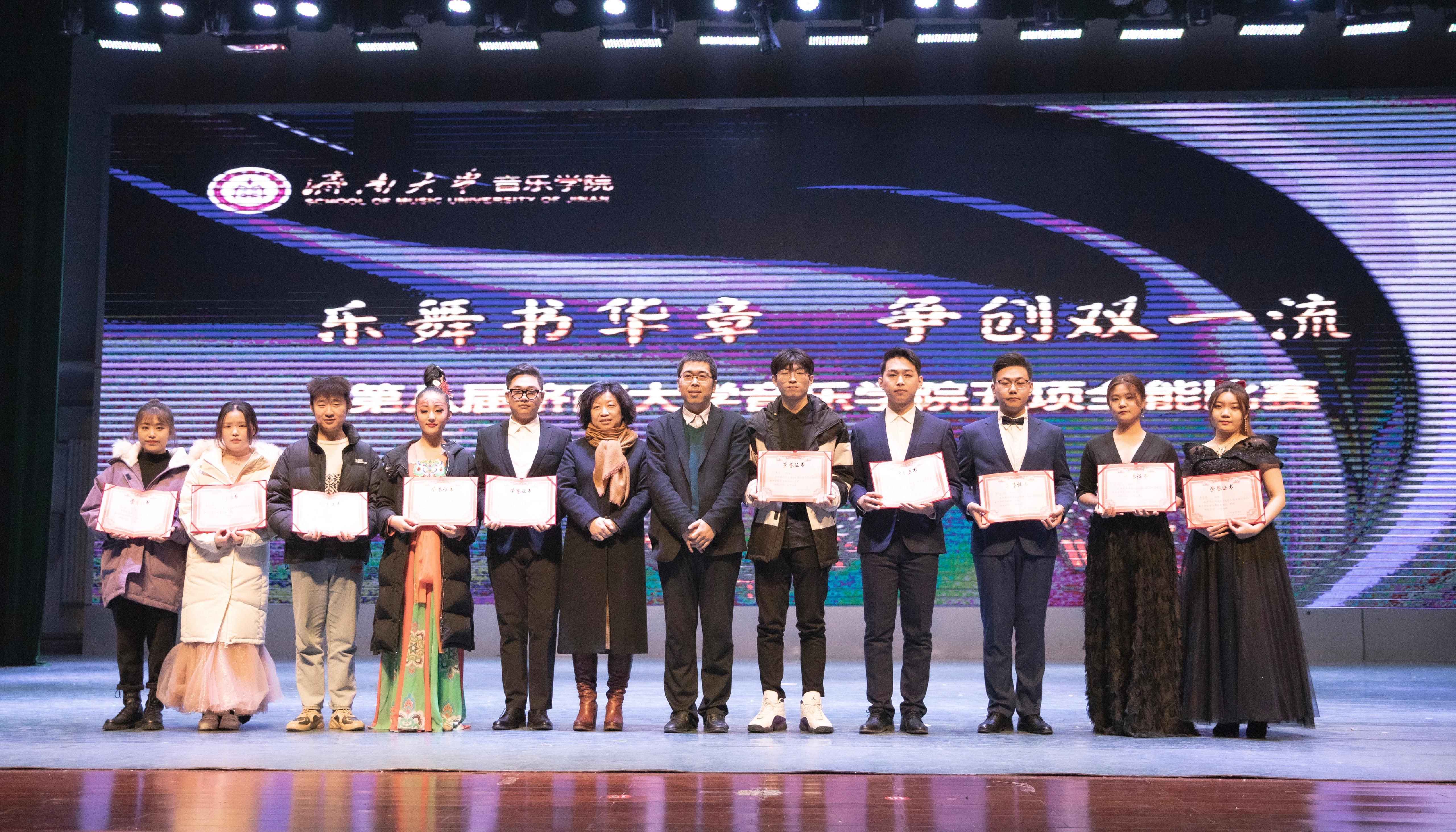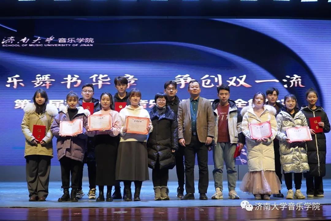本次比赛分全能组和单项组,包含歌唱与钢琴伴奏、钢琴演奏、合唱指挥、中外乐器演奏或舞蹈表演、自弹自唱等项目,共500余名学生踊跃报名,20余名教师担任比赛评委。晚会中,副校长王志,教务处副处长赵德刚,太阳成集团tyc151cc班子成员及系主任分别为获得全能组、单项组一、二、三等奖的同学颁奖。