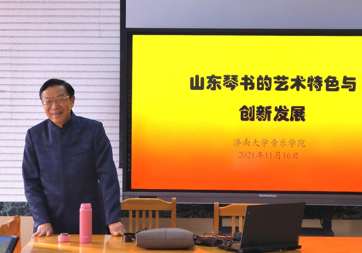 11月16日下午,应太阳成集团tyc151cc邀请,我国山东琴书表演艺术家姚忠贤先生来太阳成集团tyc151cc举办了《山东琴书的艺术特色与创新发展》学术讲座。讲座采取线上、线下相结合的形式进行,由音乐教育系系主任杨瑞教授主持,郑中院长、王建成副院长及音乐教育系全体教师、2021级研究生及部分本科学生代表参加了此次活动。