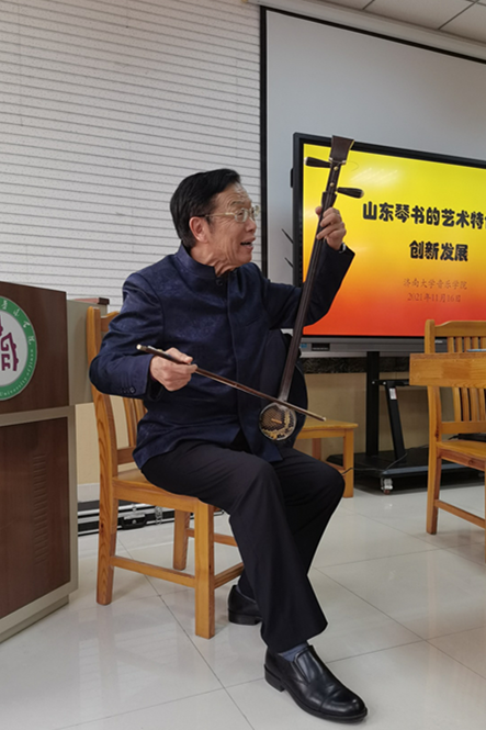 讲座中,姚先生首先详细介绍了山东琴书的来源、历史发展及艺术特色。山东琴书之所以流传300多年而久唱不衰,在于它的唱腔优美高亢,风格韵味独特的艺术魅力。继而,在传承创新方面提出了自己的见解。他认为山东琴书是一种古老艺术,要想创新发展,一定要与时俱进,跟上时代的步伐,尤其得到年轻观众的喜爱。姚先生在山东琴书的创作和演唱方面都进行了大胆创新和探索。他利用音乐的多元化形式将山东琴书改写成了年轻人比较喜闻乐见的流行歌曲,比如《青藏高原》、《月亮代表我的心》、《泉水叮咚》,李清照的诗《一剪梅》等并现场为师生进行演唱,让现场的师生们眼前一亮,旁听的学生代表们也表示这种曲艺形式能够接受,为琴书动听的唱腔、通俗易懂的故事情节,流行歌曲形式的创新编唱而动容。随后,姚先生又演唱了山东琴书《梁祝下山》、《刘伶醉酒》等经典名段,让现场的师生们大呼过瘾,欲罢不能。