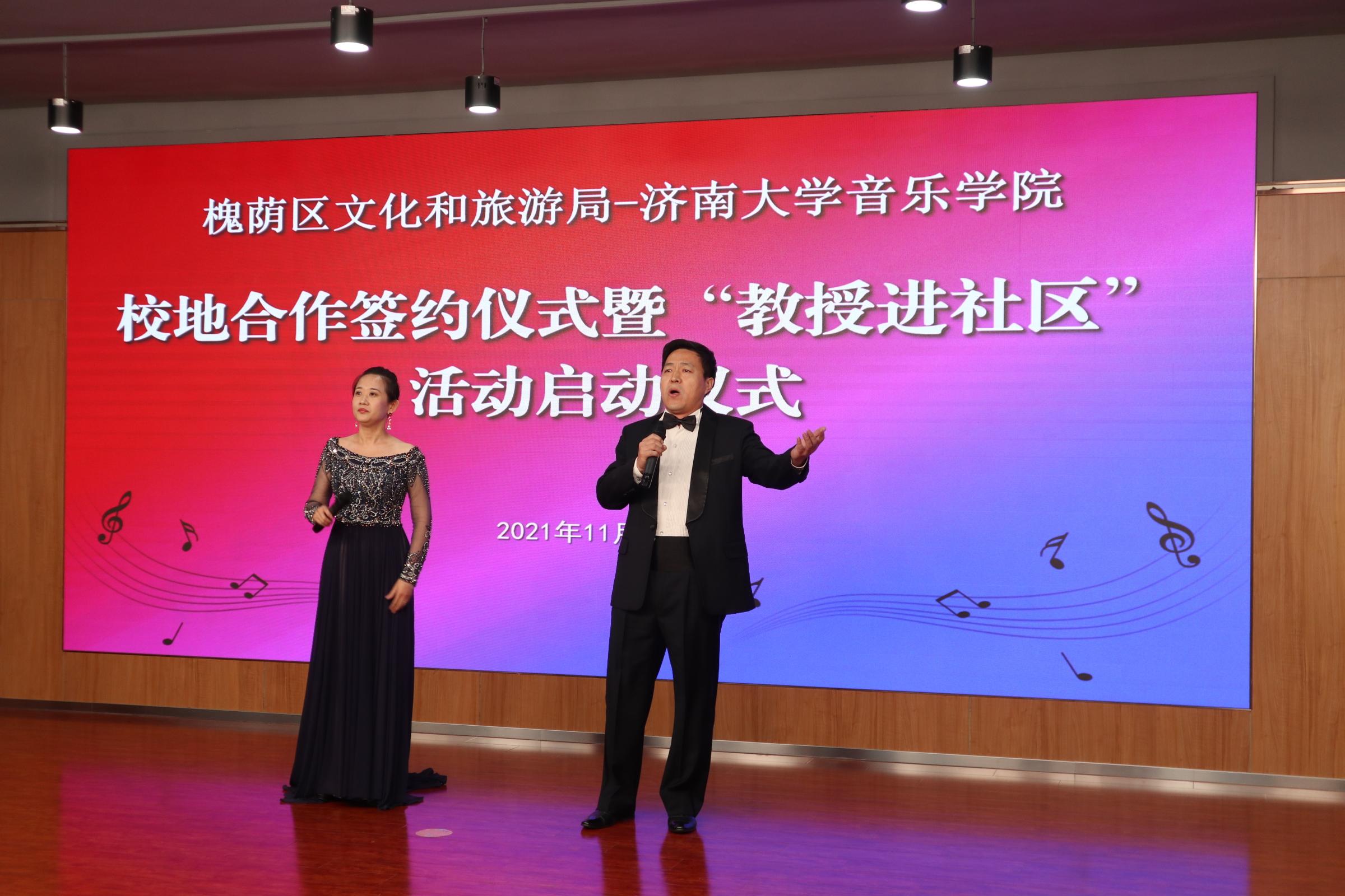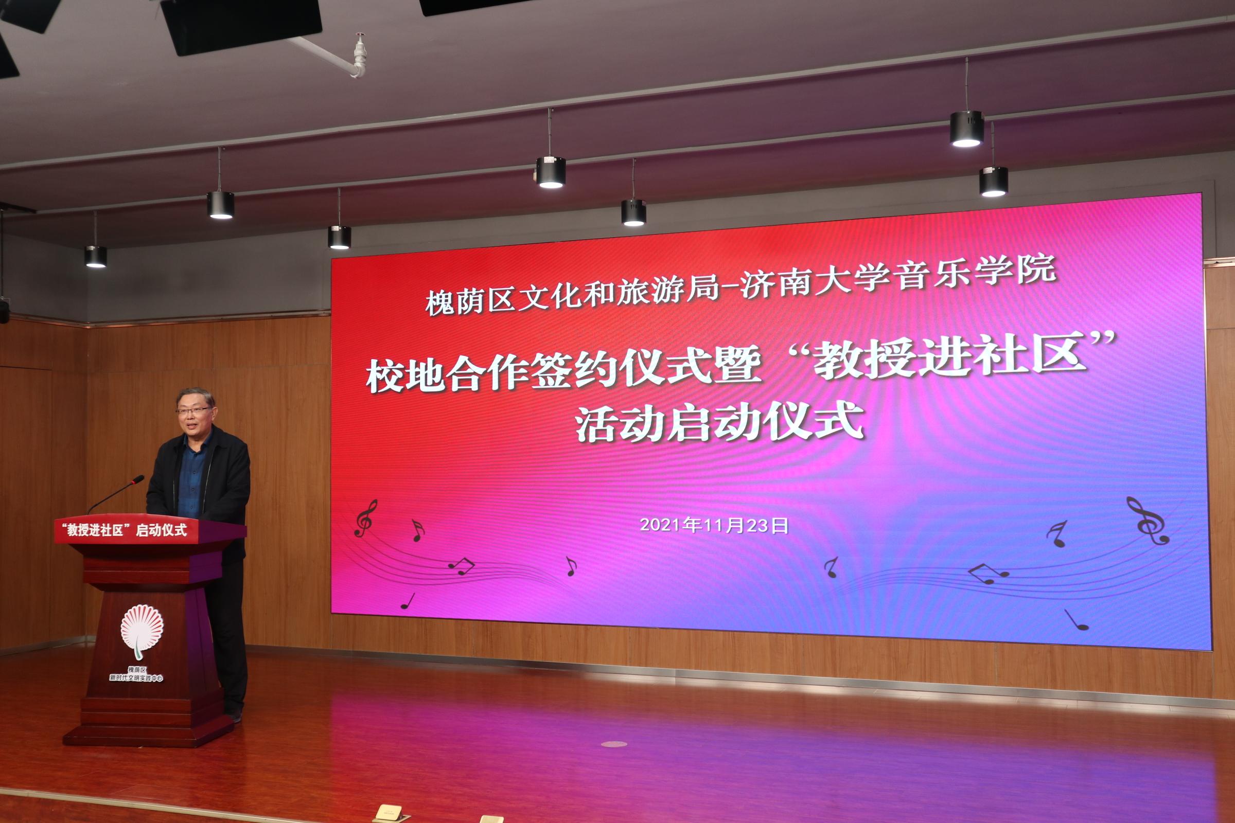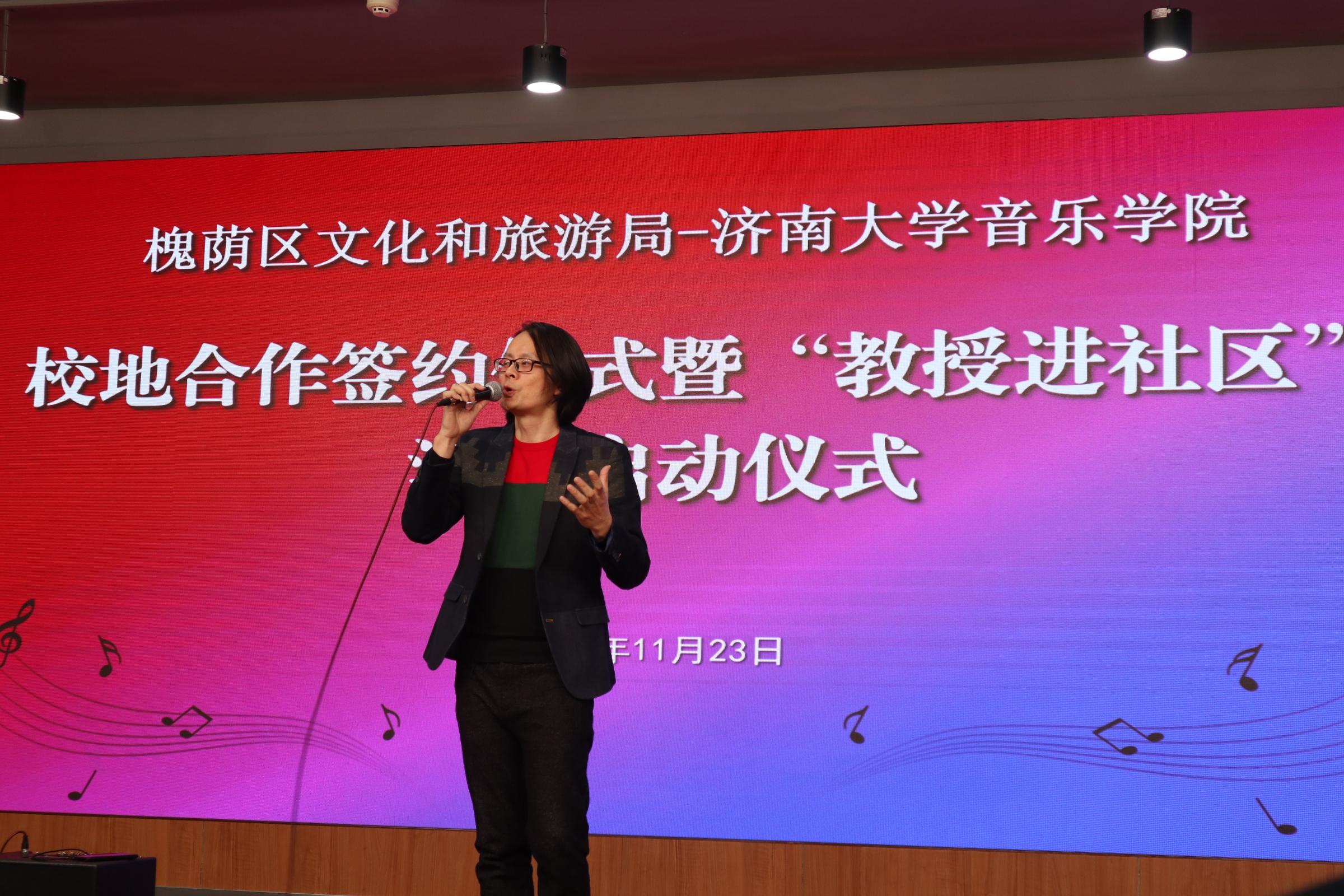 仪式上,济南市槐荫区文化和旅游局局长岳仁强在致辞中对学校表示衷心感谢,他介绍通过校地合作开展“教授进社区”活动旨在加快实现槐荫“文化兴”,由太阳成集团tyc151cc派出专家教授,一对一与槐荫区各街道开展结对协作,根据群众需求定制推出合唱、舞蹈、音乐、器乐、非遗等领域的艺术指导、队伍培训、活动策划等,将优秀传统文化和高雅艺术与基层群众文化活动相结合,力争打造“一街一艺”“一街一品”。