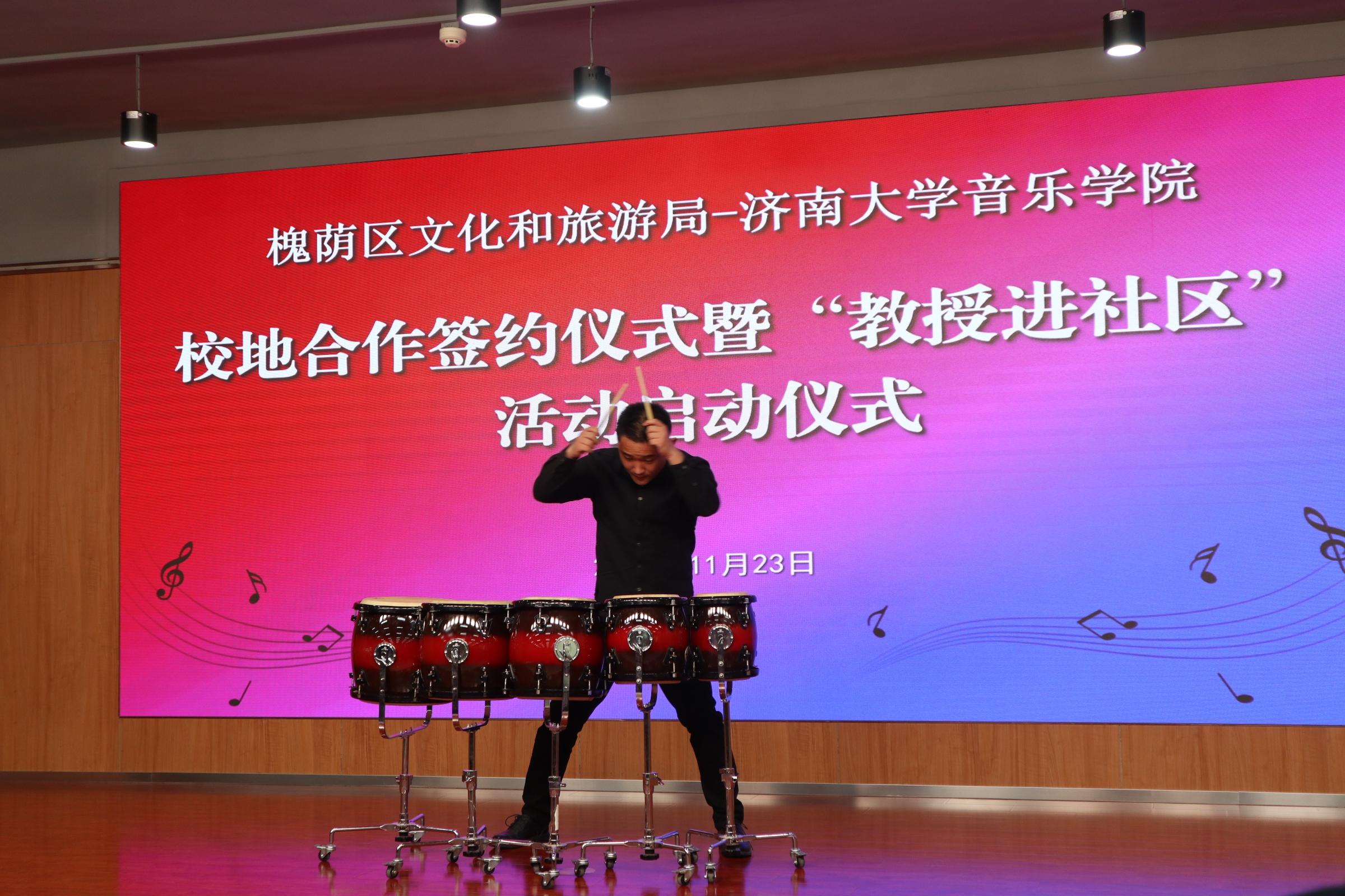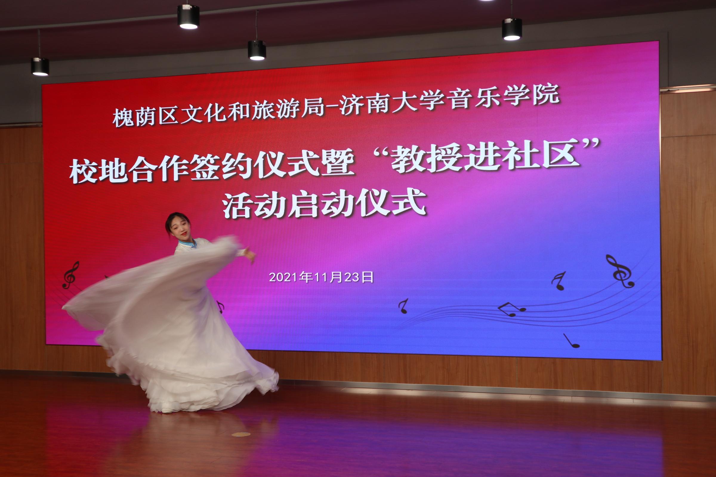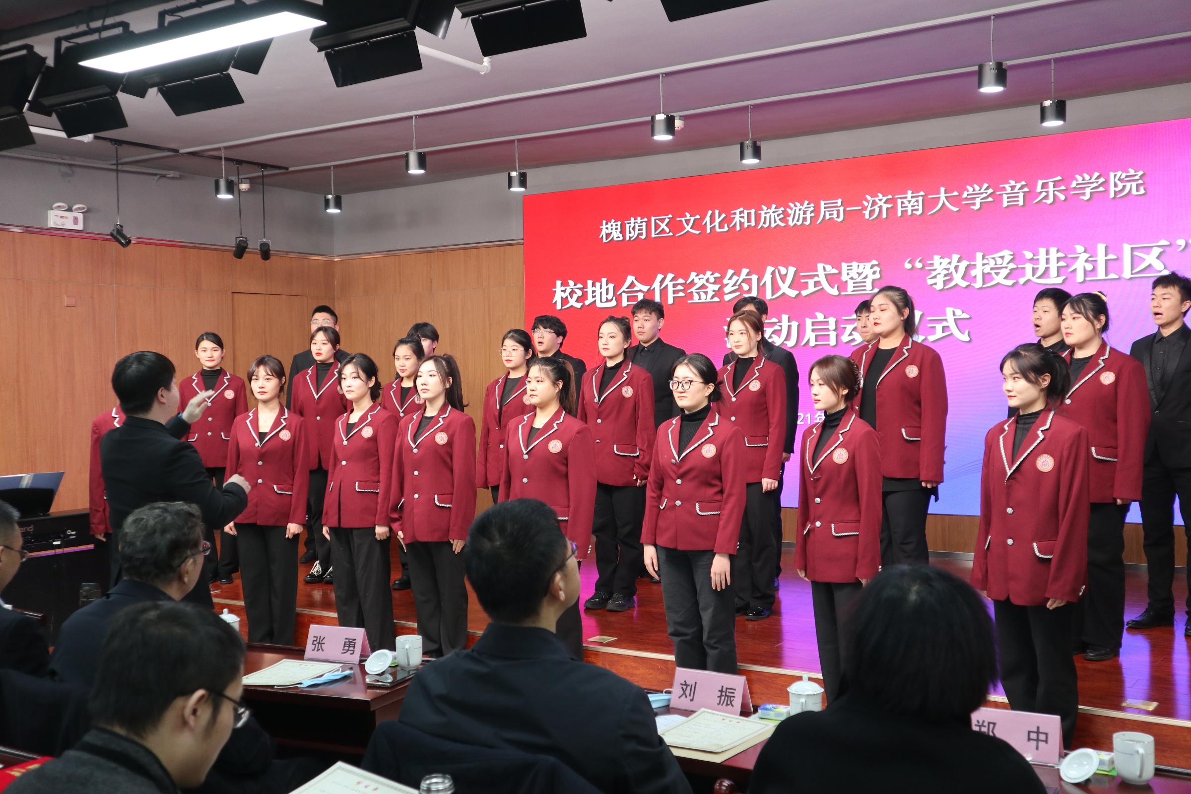 仪式上,济南市槐荫区文化和旅游局局长岳仁强在致辞中对学校表示衷心感谢,他介绍通过校地合作开展“教授进社区”活动旨在加快实现槐荫“文化兴”,由太阳成集团tyc151cc派出专家教授,一对一与槐荫区各街道开展结对协作,根据群众需求定制推出合唱、舞蹈、音乐、器乐、非遗等领域的艺术指导、队伍培训、活动策划等,将优秀传统文化和高雅艺术与基层群众文化活动相结合,力争打造“一街一艺”“一街一品”。