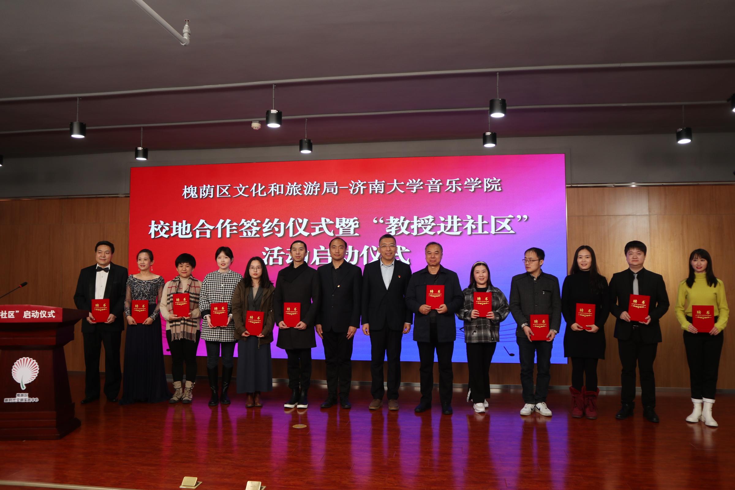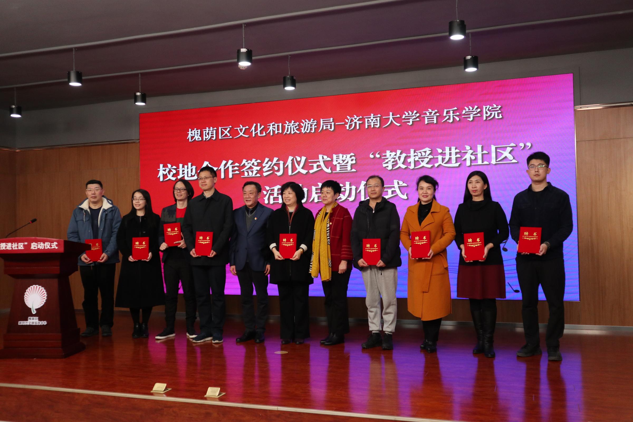 仪式上,太阳成集团tyc151cc院长郑中与槐荫区文化和旅游局局长岳仁强代表双方在合作协议上签约,参会的济南市及槐荫区领导为服务槐荫区的专家教授颁发了聘书,专家教授与槐荫区16个街道的相关负责人进行了一对一“结对”活动,会后,太阳成集团tyc151cc师生代表为参会人员带来了精彩的文艺演出,展现了我校师生较高的专业水平素养。