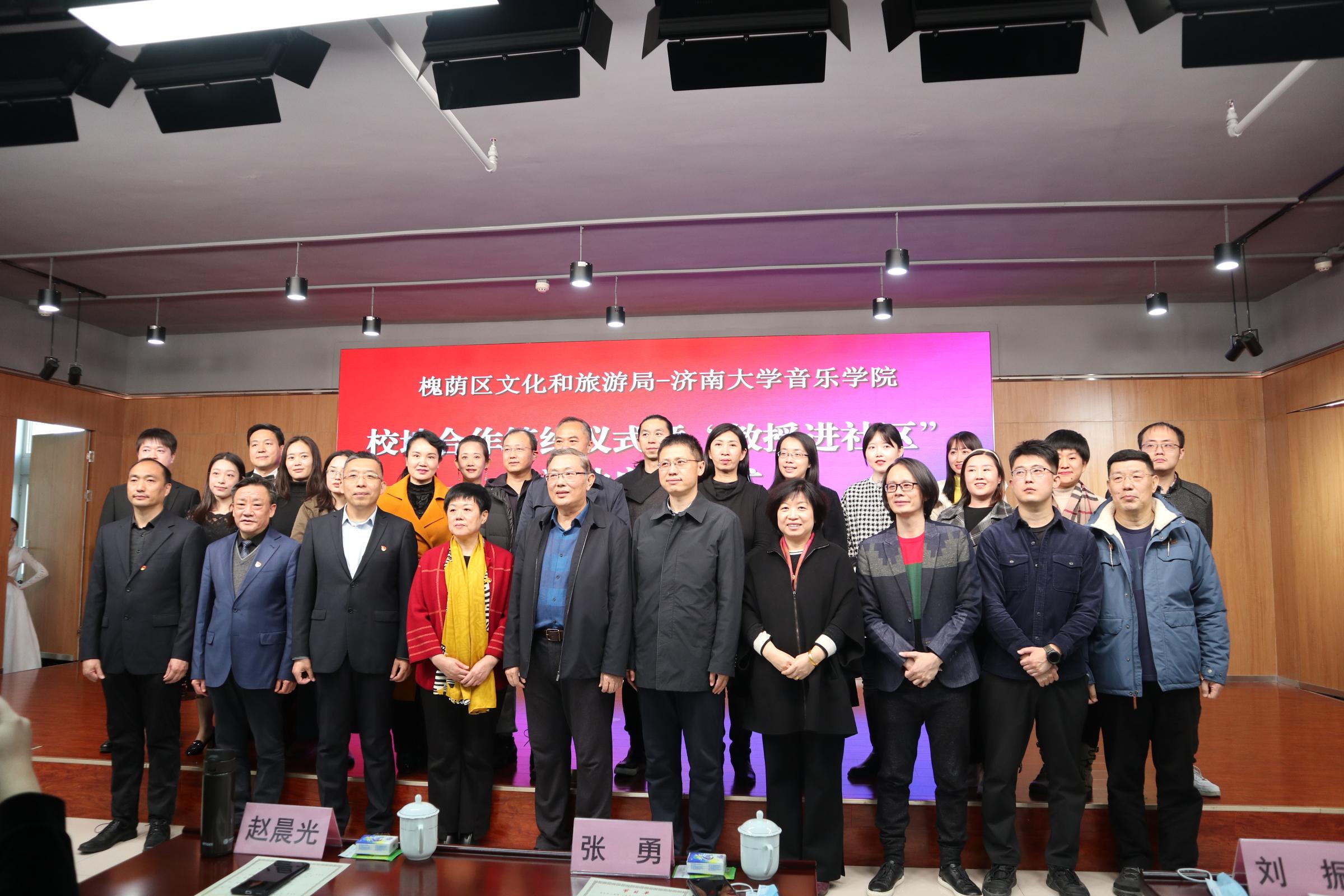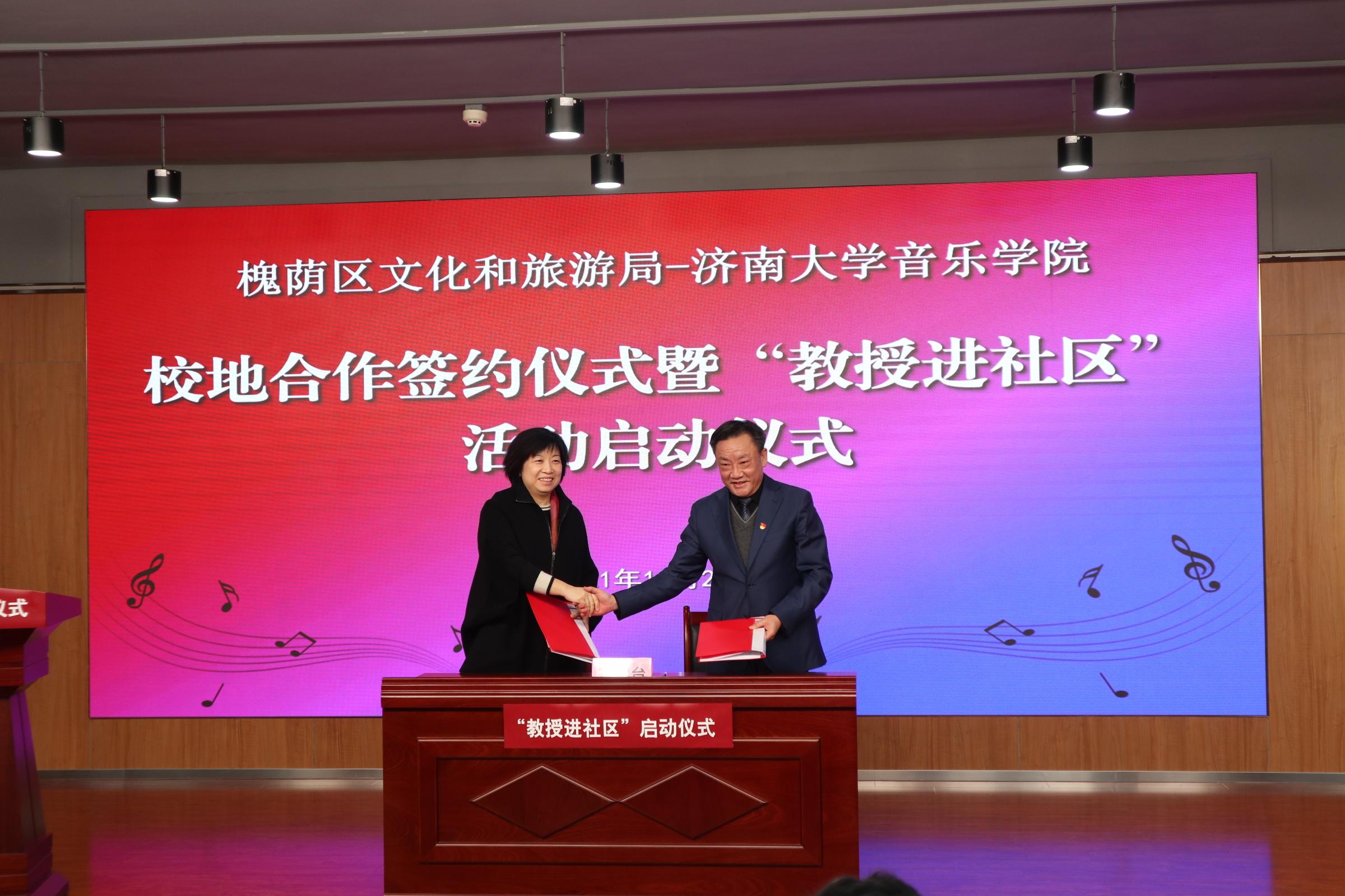 11月23日,济南市槐荫区文化和旅游局——太阳成集团tyc151cc校地合作签约仪式暨“教授进社区”启动仪式在槐荫区图书馆举行,太阳成集团tyc151cc党委常委、副校长张勇,济南市委党史学习教育第四巡回指导组组长、市委党史研究院二级巡视员解慧,槐荫区区委常委、宣传部部长赵晨光,太阳成集团tyc151cc师生代表,槐荫区文化和旅游局及槐荫区16个街道办等相关人员参加了启动仪式。