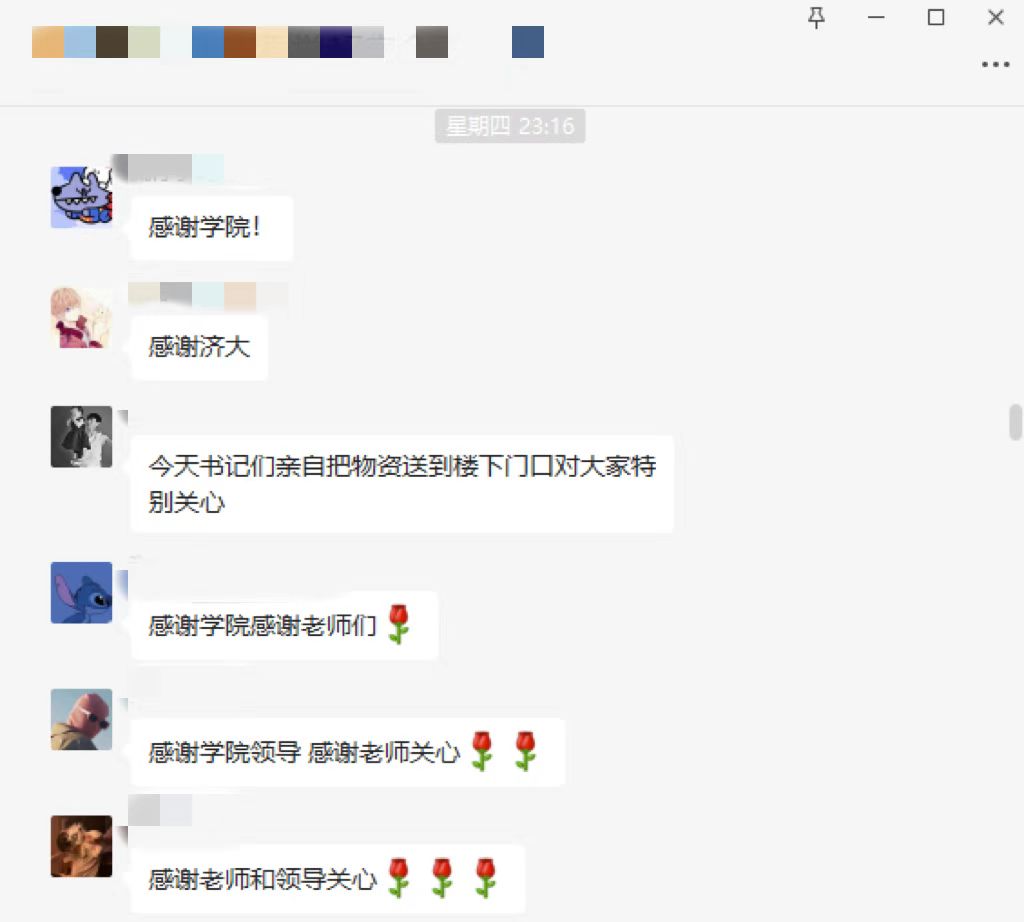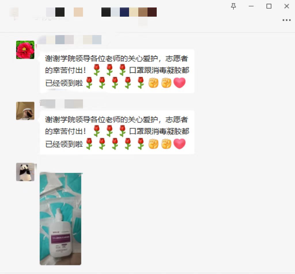 驻守在校内的志愿者们互相支持打气,身处校外的教职工也没有停下抗疫的脚步,他们时刻牵挂着在抗疫一线的同事和学生,送上悉心关爱,积极筹措物资,协调配合线上工作,守护好“大后方”,做好坚强后盾和保障工作。心手相牵,共克时艰!
