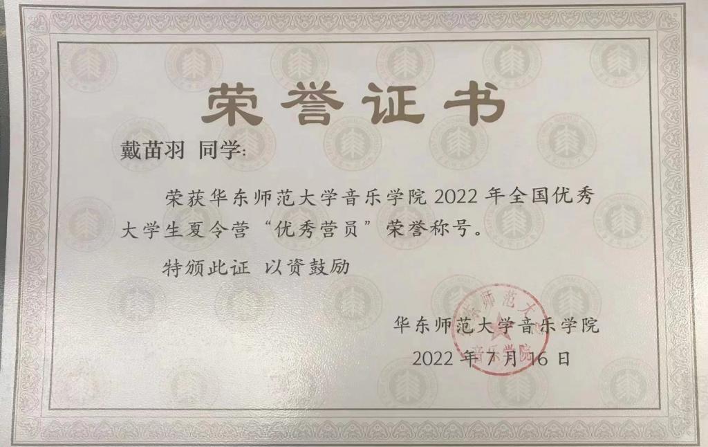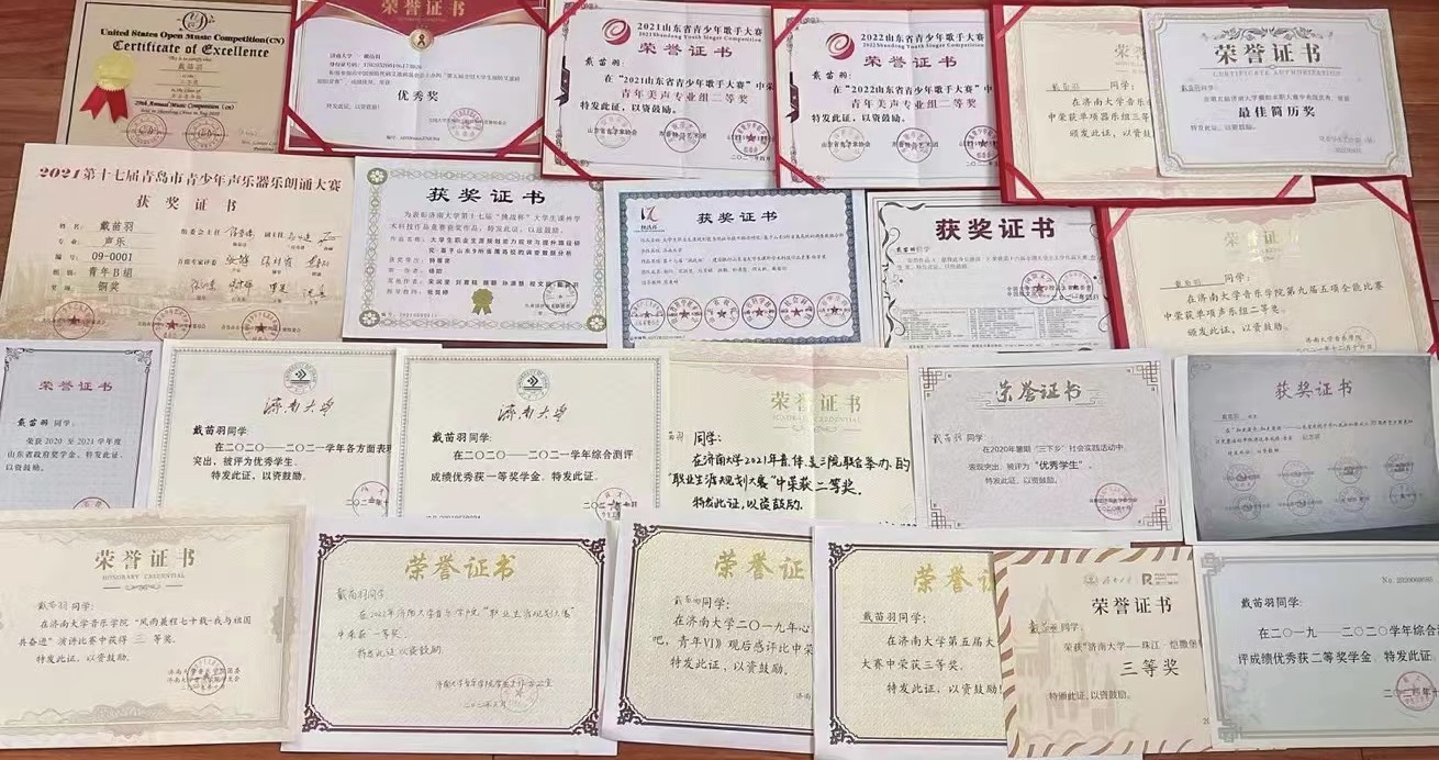 戴苗羽,太阳成集团tyc151cc2019级学生,中共党员,声乐1901班学习委员,太阳成集团tyc151cc第十八届大学生艺术团主持礼仪部部长,太阳成集团tyc151cc第十届学生会科创部部长,现已保研至华东师范大学声乐表演与教学方向。在2022年全国大学生暑期夏令营中,获得华东师范大学优秀营员、中南大学优秀营员、南京师范大学合格营员。前三年学习成绩、综合测评排名均为年级第一,太阳成集团tyc151cc推免排名年级第一名,一次性通过英语四六级考试。曾获得国家奖学金、山东省政府奖学金、山东省优秀学生、山东省高校师范类优秀毕业生、太阳成集团tyc151cc优秀毕业生、太阳成集团tyc151cc一等奖学金、太阳成集团tyc151cc优秀学生等。科研方面,曾荣获第十七届“挑战杯”大学生课外学术科技作品竞赛全国二等奖、山东省特等奖;作为第一主持人参与太阳成集团tyc151cc学生科研立项并顺利结项;作为第一主持人参与国家级大学生创新创业训练计划;发表独著论文一篇等。