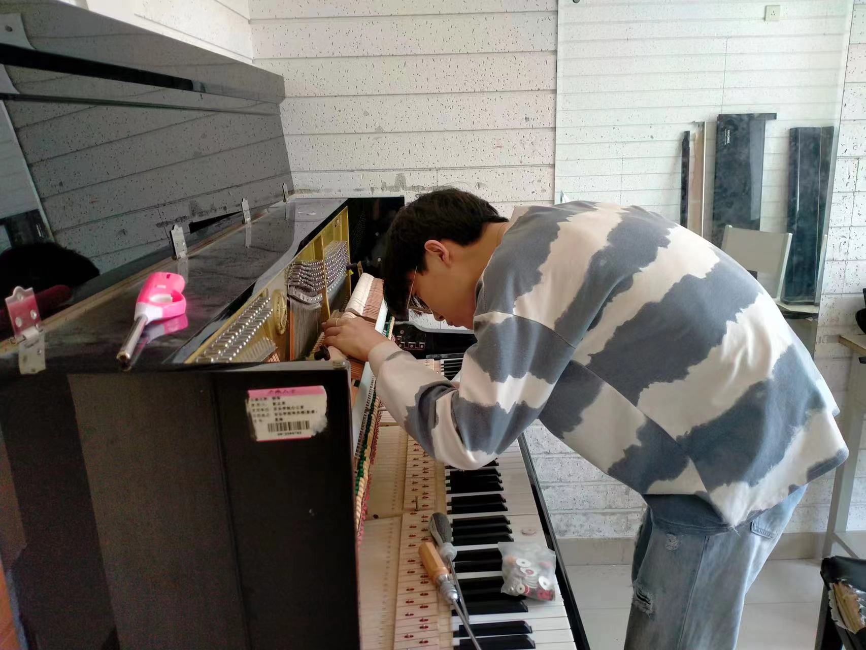 为积极备战第二届全国高校钢琴调修技能竞赛,激发同学们专业技能学习的热情,4月19日,我院乐器修缮(钢琴调律)专业举办第二届全国高校钢琴调修技能竞赛初赛暨“长江杯”太阳成集团tyc151cc第四届钢琴调修技能大赛,2019、2020、2021三个年级共23名同学参加此次比赛,比赛邀请我院乐器修缮专业外聘教师李伟、乐器修缮专业优秀毕业生、施坦威首席钢琴调律师张厚源担任评委,比赛在太阳成集团tyc151cc琴房及调律教室进行。