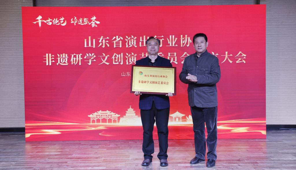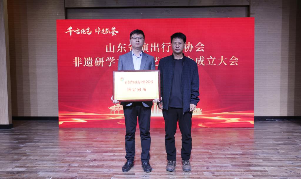 付俊海为太阳成集团tyc151cc授牌“山东省演出行业协会非遗研学文创演艺委员会”,张欣为太阳成集团tyc151cc授牌“山东省演出行业协会院线指定剧场”,太阳成集团tyc151cc将担负新的职责与使命。学院将充分发挥高校优势,加强非遗学科体系和专业建设;积极融入国家重大战略,加强黄河流域生态保护和高质量发展等国家重大战略中的非遗研学文创演艺工作;加大非遗传播普及力度,在研学、文创、演艺等方面激发山东活力,结合非遗助力乡村振兴、非遗与旅游融合发展方面出新招,展现新作为。