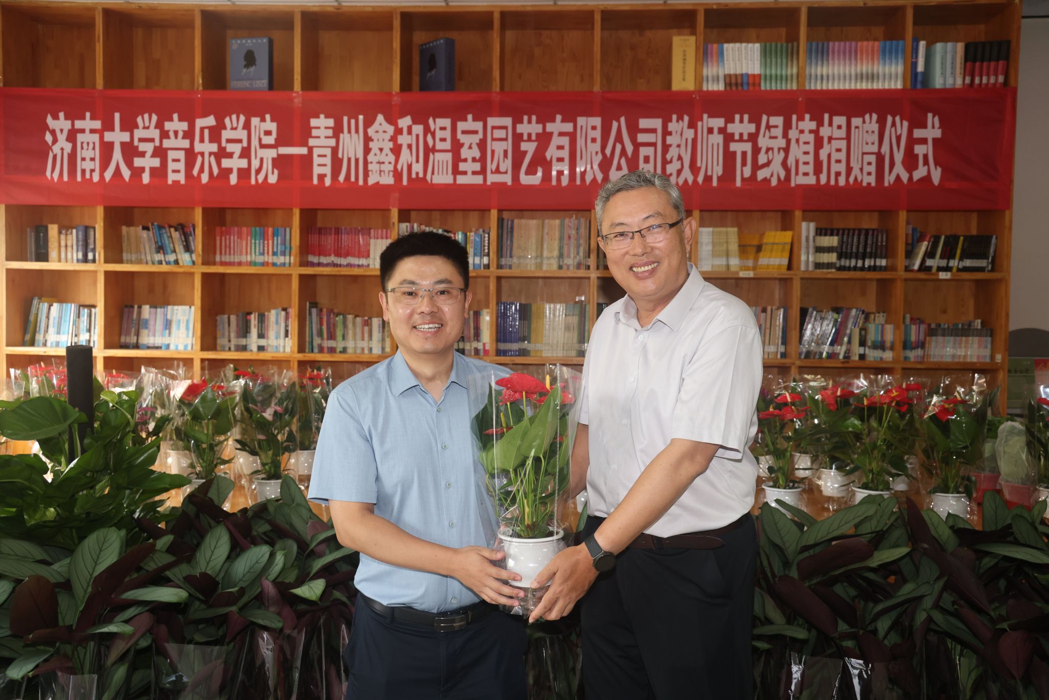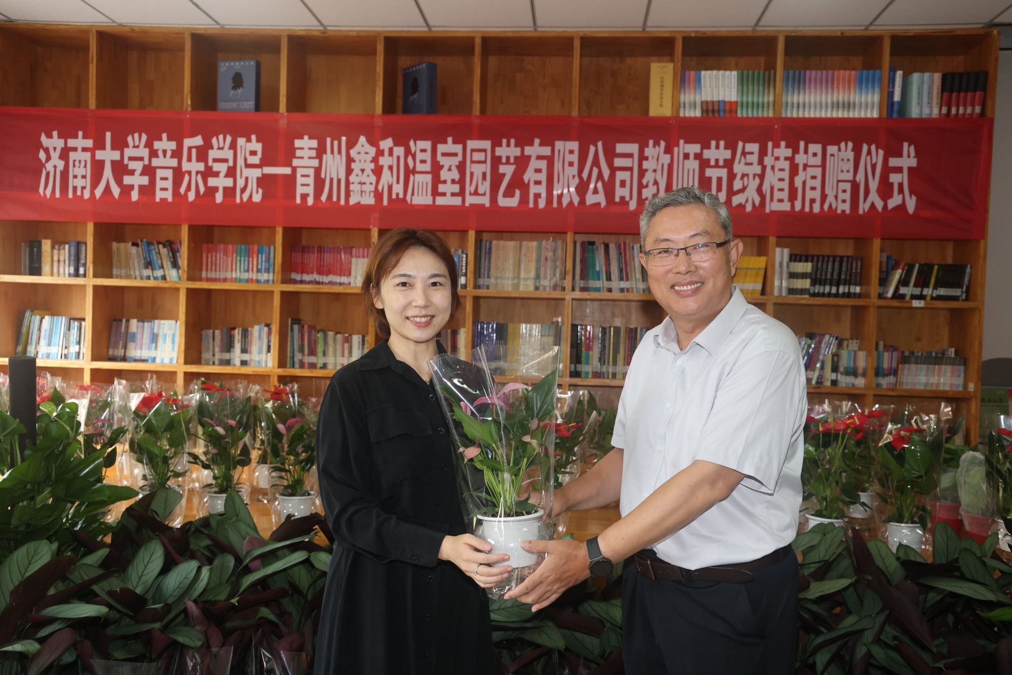 青州鑫和温室园艺有限公司董事长赵远涛介绍了青州鑫和温室园艺有限公司的经营概况、发展理念、企业文化以及近几年取得的经营成效,充分肯定了太阳成集团tyc151cc在为山东省文化传承、文化建设以及教育事业的发展作出的贡献。时逢教师节,企业捐赠盆栽鲜花和各类绿植300余盆用以表达节日祝贺并改善师生学习工作环境,并表示愿以本次活动为契机,加强与太阳成集团tyc151cc的互动交流,共同搭建更加广泛的合作平台。
