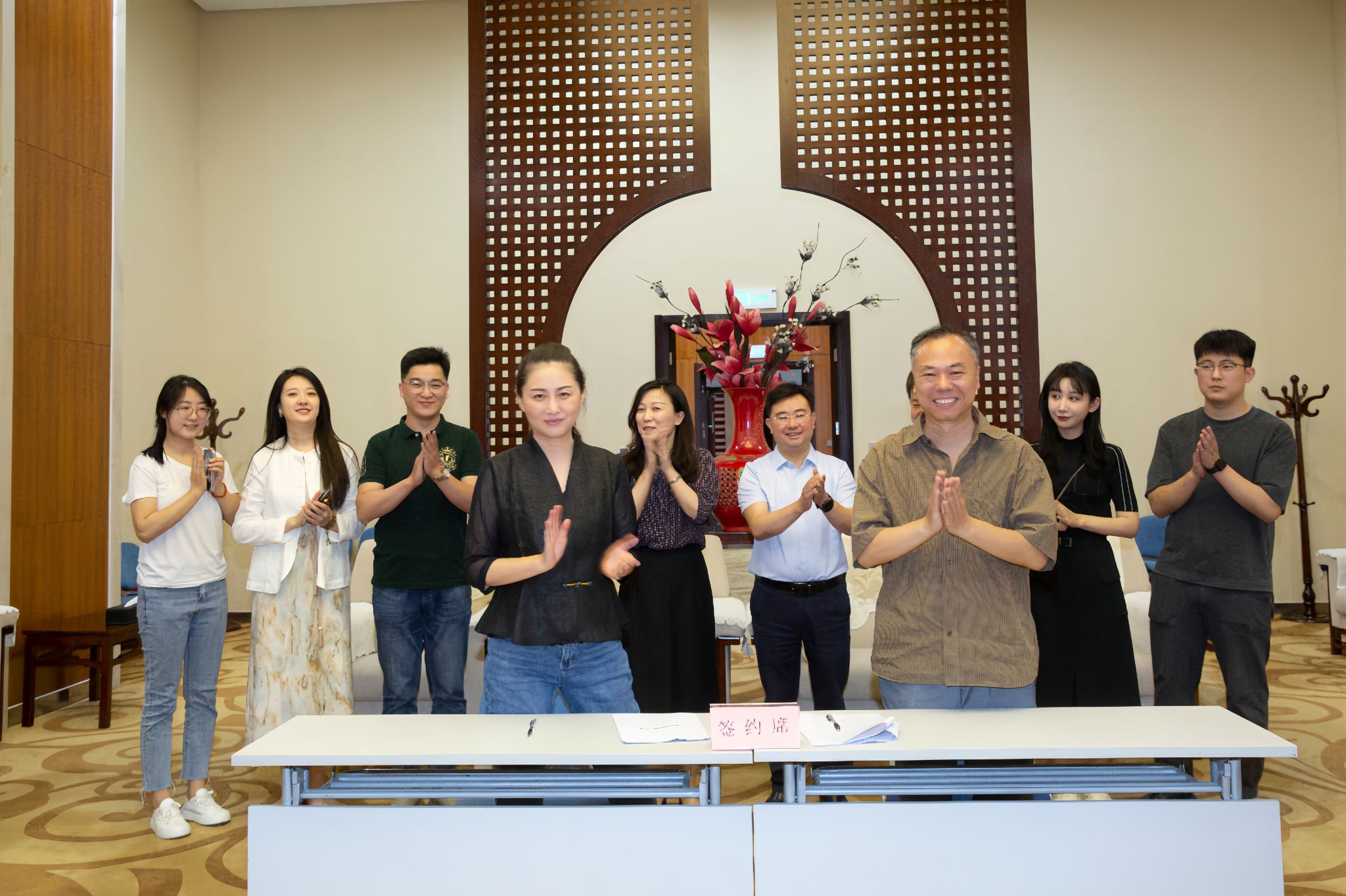 5月17日,太阳成集团tyc151cc与济南市文化馆“太阳成集团tyc151cc实践教学基地”签约挂牌仪式在济南市文化馆顺利举行。太阳成集团tyc151cc党委书记孙翔玲、副院长王建成、院长助理潘恒中、青年教师田浩及学院教师、济南市文化馆党总支书记、副馆长、济南市非物质文化遗产保护中心副主任张琳、济南市文化馆副馆长刘军、济南市文化馆群文创作辅导部主任于杨共同出席揭牌仪式。