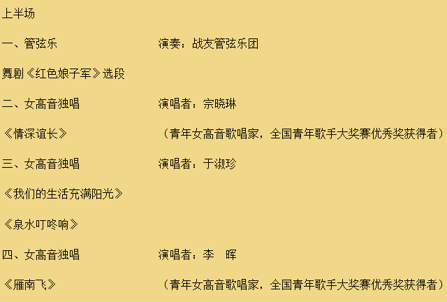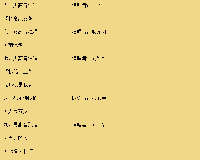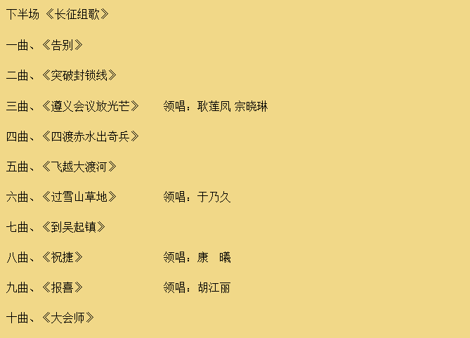 年为主题的演出盛事。演出分为《长征组歌》和“红歌会”上下场两部分,著名歌唱家刘斌、于淑珍、刘维维、耿莲凤、于乃久、著名朗诵表演艺术家张家声等将在上半场轮番登场,演唱多首当年由他们唱红的经典歌曲。《长征组歌》部分由军旅指挥家蒋燮斌指挥,战友文工团合唱团、交响乐团共200
