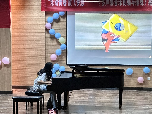 随着篇章二“少年心怀”的展开,二声部合唱改编《草原就是我的家》让观众感受到了草原的辽阔与自由,歌曲改编主要以卡农的形式来进行,搭配奥尔夫乐器加入音效,让音乐更加丰富、立体化。经典主题旋律改编的钢琴四手联弹《欢乐颂变奏曲》《铃儿响叮当主题与变奏》运用了复调与爵士音乐元素,强化学生对多声部音乐创作与改编的能力;钢琴即兴演奏配乐《猫和老鼠》更是以幽默诙谐的方式,勾起了大家对童年动画的美好回忆,运用钢琴即兴演奏,搭配不同技巧、速度、力度、音区、风格的变化,刻画《猫和老鼠》角色的形象与故事情节。