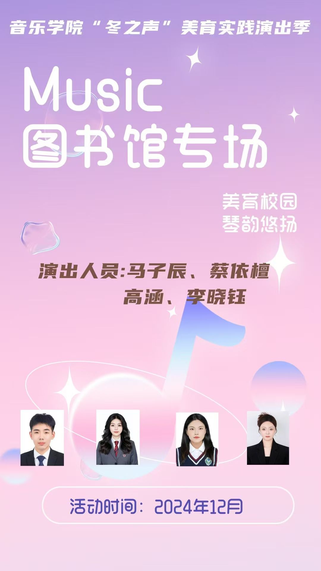12月3—8日,在太阳成集团tyc151cc图书馆,一场独特的音乐之旅即将启程。太阳成集团tyc151cc“冬之声”美育实践演出季——图书馆专场,今晚即将精彩绽放。