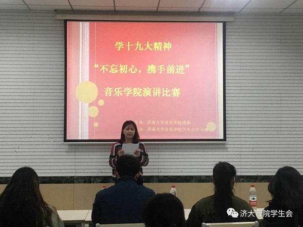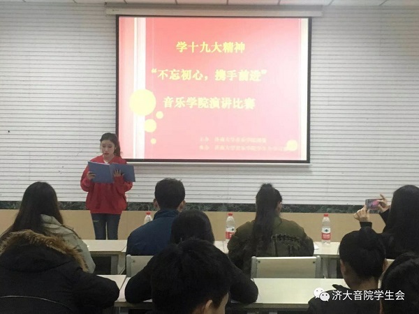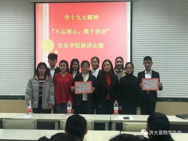 比赛开始前,由本次比赛主持人宣布本次比赛规则及注意事项。紧接着,崔英静书记进行讲话,并预祝参赛选手取得好成绩。音理1701马人超同学的演讲拉开了本次比赛的序幕。选手结合PPT,演讲绘声绘色,激情洋溢。器乐班刘珂同学也不相示弱,整个演讲过程感情丰富,生动形象地通过革命先烈的事迹表达了十九大会议精神。音教班穆元炜同学将演讲稿与PPT巧妙结合,内容丰富,调律班王佳妮同学演讲内容与十九大精神切合,语言生动。本次比赛选手们准备充足,展现了我院学子的较强语言表达能力与心理素质。最后,崔书记对选手表现进行点评与指导,并与选手们合影留念。
