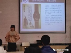 由主持人宣布交流会开始后,先由音理1701班李成浩同学分享了他所阅读的书籍《干法》,又由器乐1701班胡心艺介绍了《论语》一书,并且选择了一段进行分享。他们对书籍的介绍使其他同学也对这些书籍有所了解,引起其他同学的兴趣。