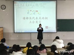 本次大会由宣传部副部长张刘畅主持,简短的开场之后,办公室干事王壮作为干事代表进行发言。王壮同学代表干事对过去半年工作进行反思,并对下一学年的工作树立了目标。随后,自律部副部长吴雨桐作为部长代表发言,她简要回顾了过去半年各部门的工作,分享了部分工作经验。紧接着,学生会主席王建丽对过去的工作进行总结,并对下半学期的工作做了规划。最后,于洋老师讲话。于老师首先对过去半年同学们的工作给予肯定,相信这是对同学们最好的鼓励。于老师提出:“要将学生会活动品牌化、精细化,把‘艺蕴人生’