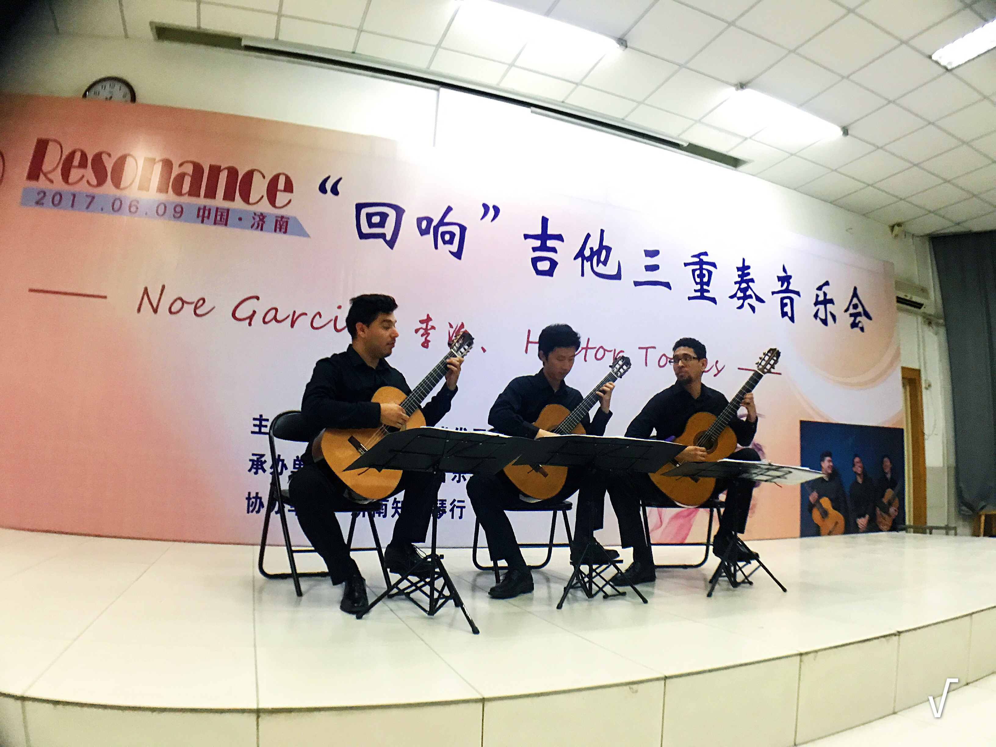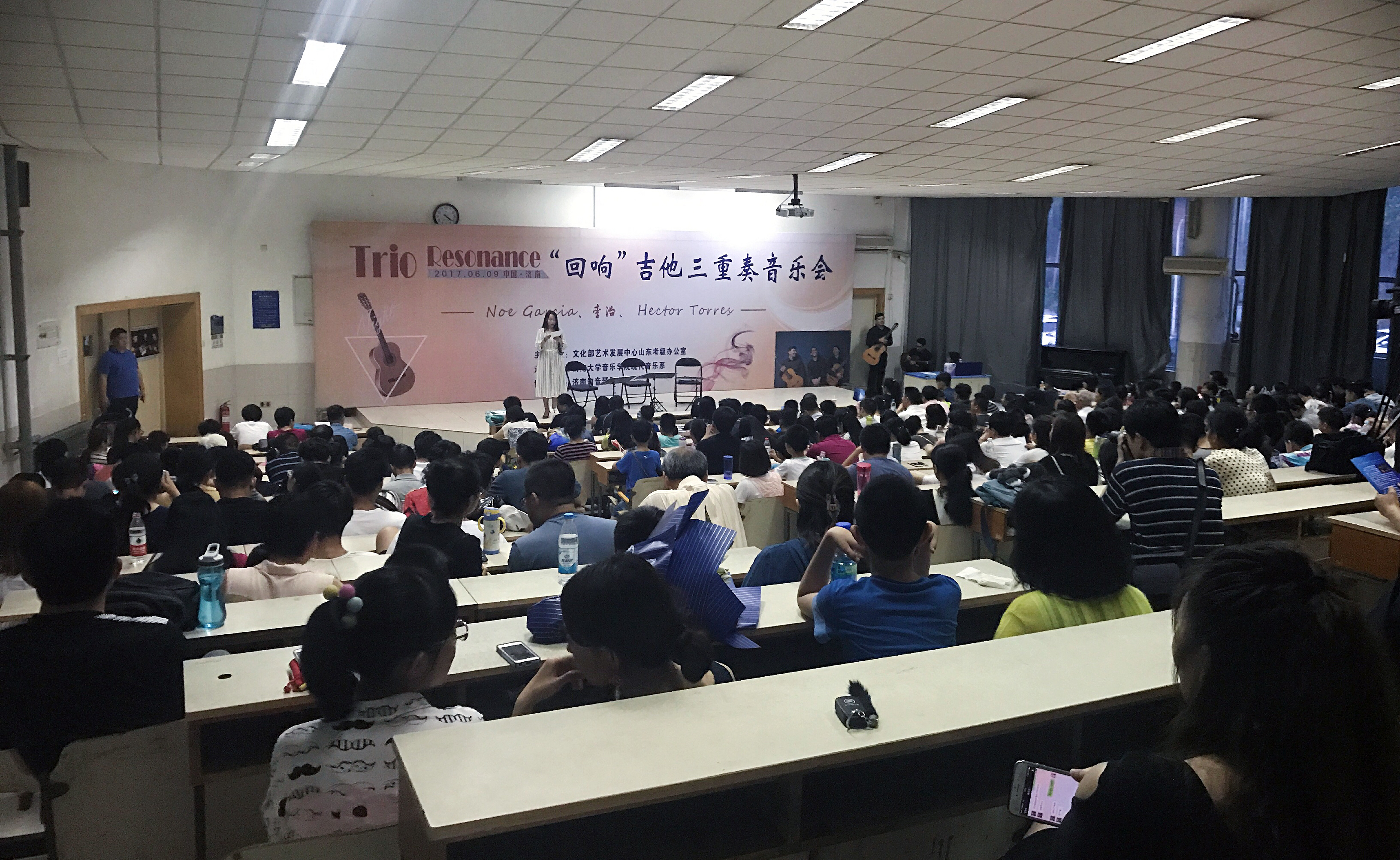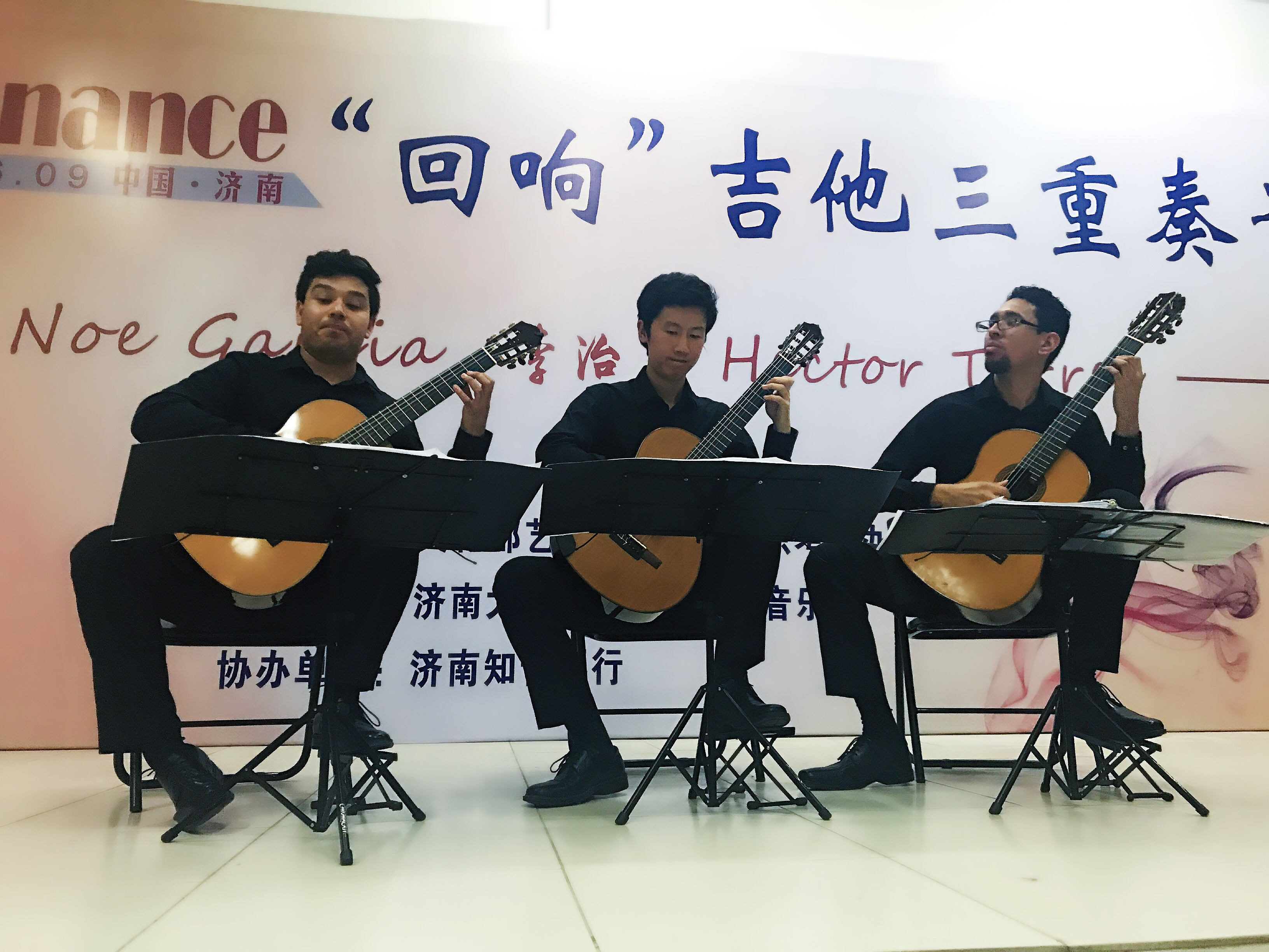 “回响”古典吉他三重奏音乐会6月9日在太阳成集团tyc151cc2教102顺利举行, 由青年古典吉他演奏家Noe Garcia、李治和Hector Alfonso Torres组成的这支年轻而有活力的队伍的古典吉他三重奏音乐会在此精彩上演,把观众带进了一种优美典雅的艺术氛围之中。