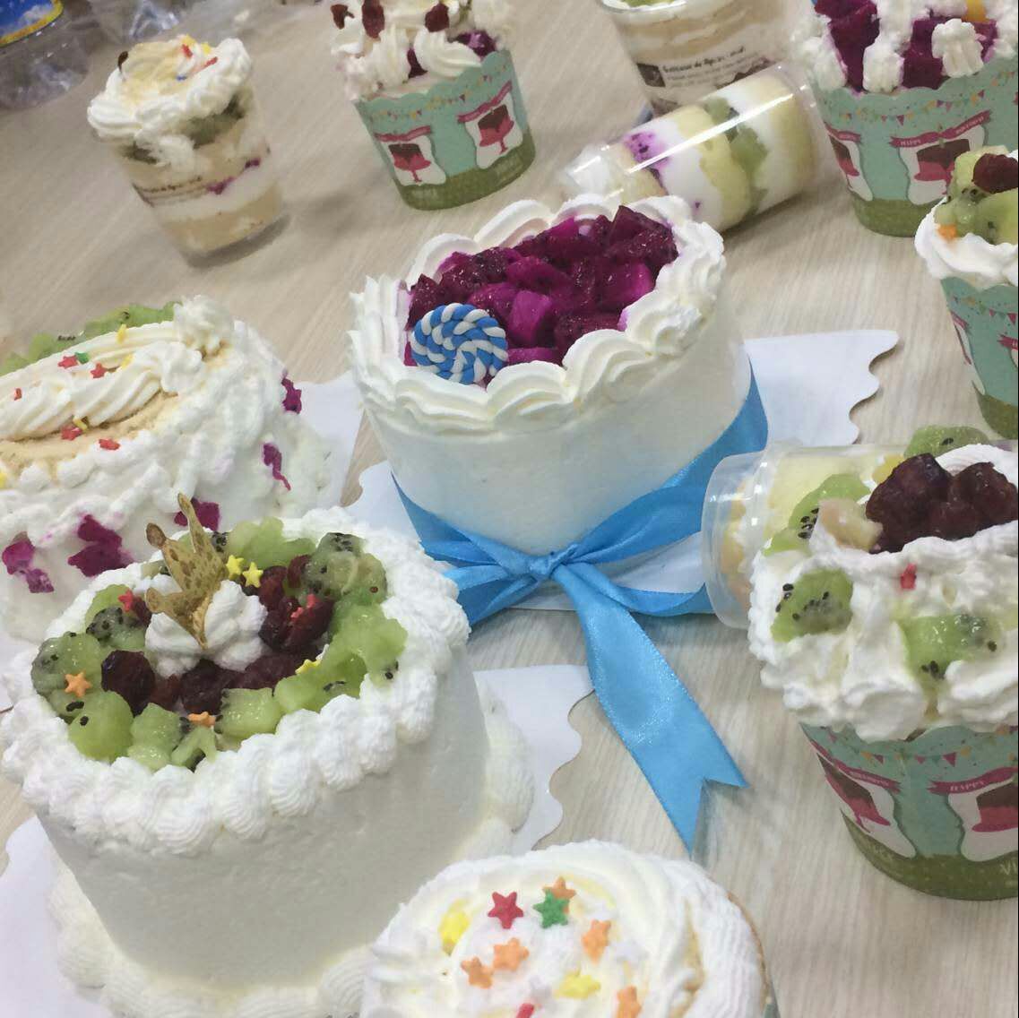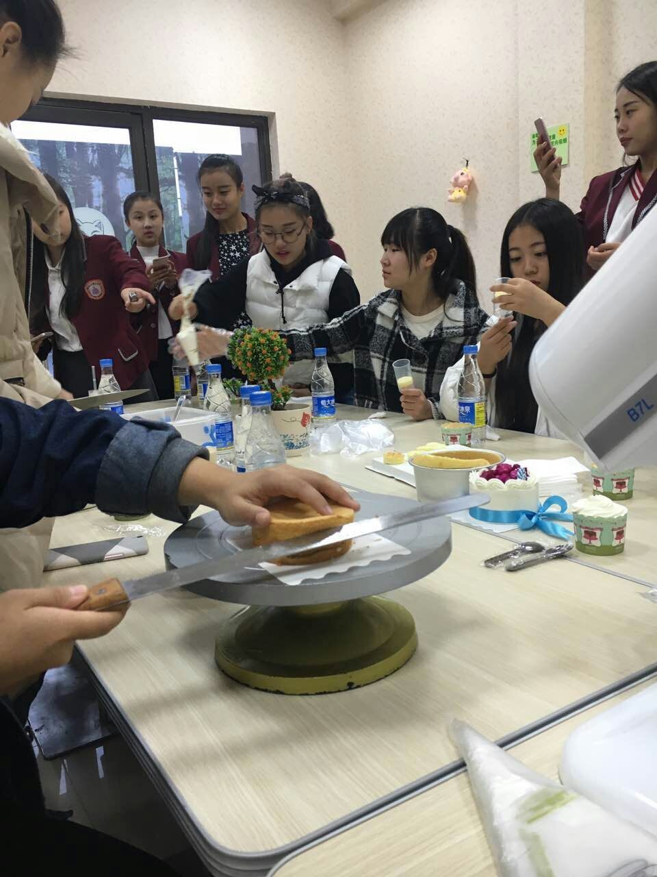 鉴于大家对蛋糕技术的生疏,我们邀请了烘焙坊的专业烘焙师进行了讲演与示范。大家目不转睛的盯着烘焙师的每一个动作,生怕漏掉了细节。转眼间,烘焙师的制作便完成,一个蛋糕成品出现在大家眼前,大家也按捺不住激动的心情,即刻开始了制作。他们满心的喜悦,拿着工具有模有样地进行抹胚、画图、挤花、装饰,俨然一副专业蛋糕师的模样。两个多小时悄然过去,令人期待的蛋糕终于制作完成,房间里飘散的香味令人垂涎三尺,幸福的表情挂在每个人的脸上。烘焙师也对成品进行了评价和指点,活动在欢声笑语中结束了。