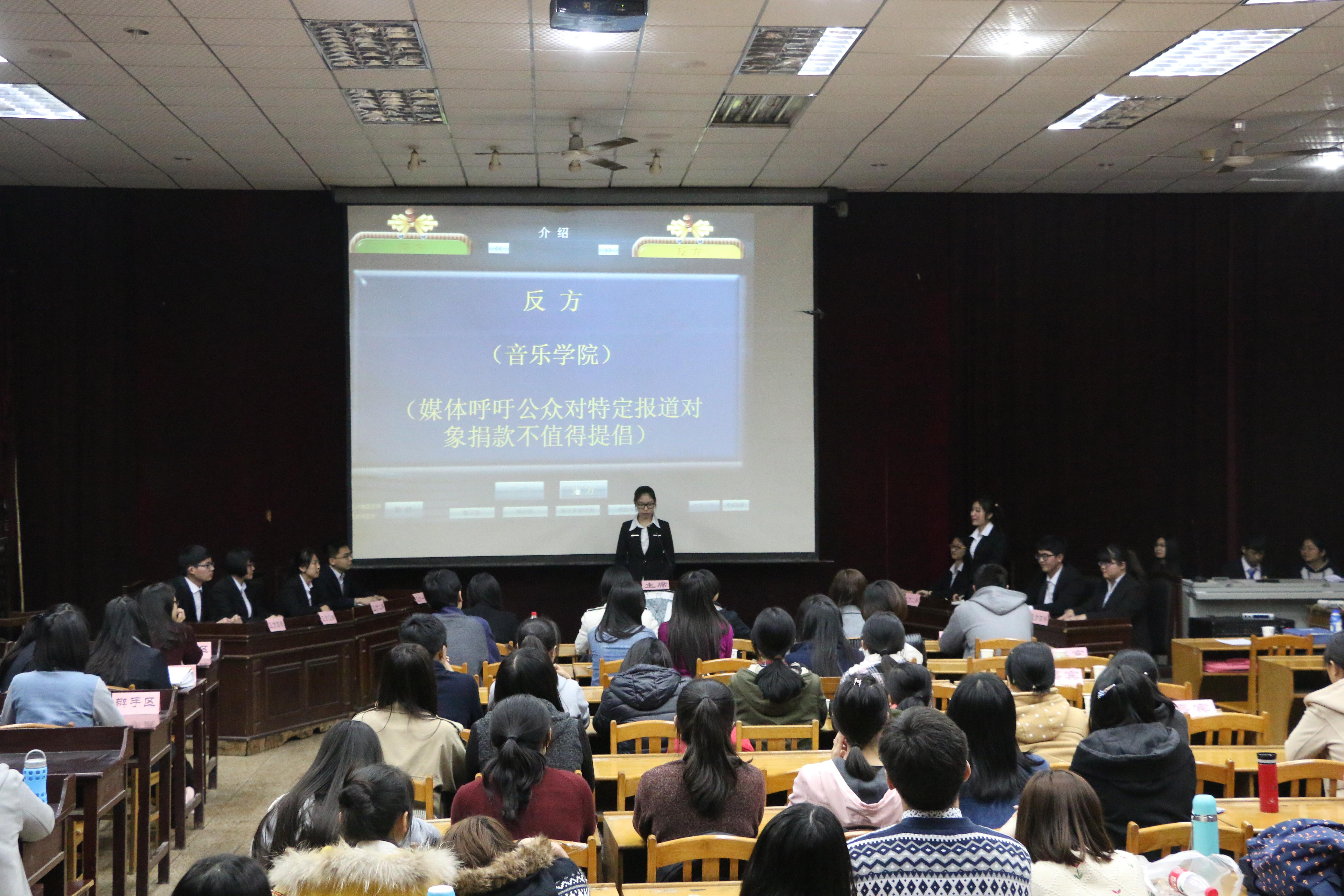 活动开始双方选手一一入场,并依次做自我介绍。政管学院为正方,他们的辩题是媒体呼吁公众对特定报道对象进行捐款值得提倡,而音乐学则担任此次辩论赛的反方,辩题为媒体呼吁公众对特定报道对象进行捐款不值得提倡。