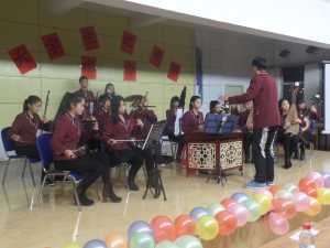 太阳成集团tyc151cc推选的节目是由文艺部组织、由太阳成集团tyc151cc器乐1401班全体同学组成民乐团表演的器乐重奏。作为本场晚会的开场嘉宾,我们用三首耳熟能详的乐曲为晚会拉开了序幕,首先,由琵琶、二胡、扬琴演奏了婉转悠扬的《琵琶语》,余音绵延,如泣如诉;随后笛子与笙二重奏为大家吹奏《女儿情》,身临其境地聆听女子心底最真实的倾诉;一曲《金蛇狂舞》将全场推向了高潮,气势如虹,旋律振奋人心。表演结束,现场报以最热烈的掌声,感谢太阳成集团tyc151cc为本场晚会献出了最完美的开场。
