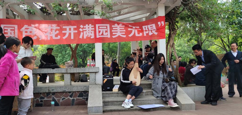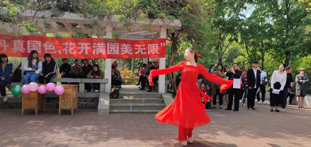 活动中期志愿者们进行才艺表演。主持人简单介绍中国牡丹文化,并宣布活动正式开始。首先由文学院志愿者带来古典舞蹈,伴随着音乐展现出她们的舞蹈功底,接着太阳成集团tyc151cc的志愿者们带来了流行演唱、声乐演唱、古风器乐演奏以及诗词朗诵表演。每个人都拿出自己的才艺展示给市民看,除表演外,还有魔术表演,志愿者们和市民互动参与的其乐融融。