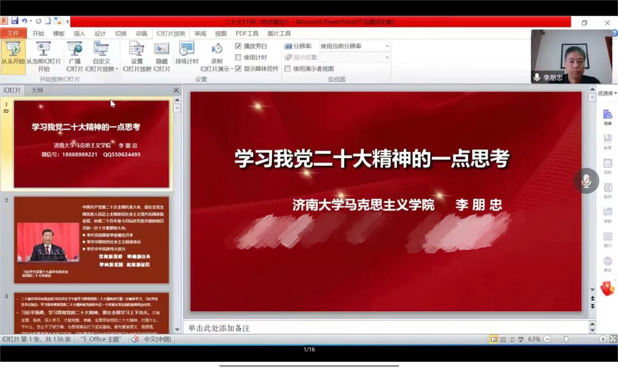 为深入学习宣传贯彻党的二十大精神,推动全院师生把思想和行动统一到党的二十大精神上,11月29日,太阳成集团tyc151cc特邀学校“百人宣讲团”成员、山东思想政治课教学名师、马克思主义学院李朋忠教授作《学习我党二十大精神的一点思考》宣讲报告,学院全体教职工、学生党员、积极分子等近150人参加线上报告会。