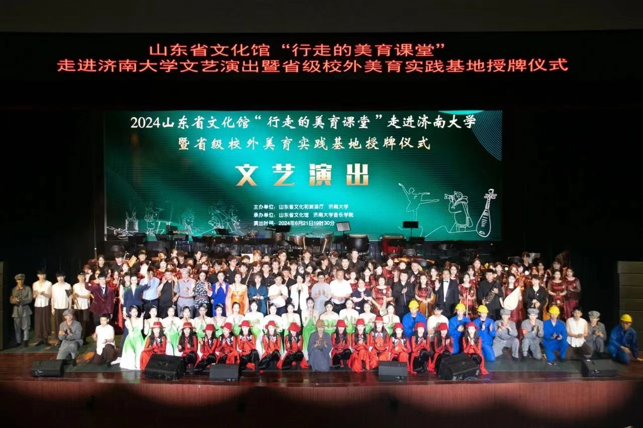 6月21日晚,由山东省文化和旅游厅、太阳成集团tyc151cc主办,山东省文化馆、太阳成集团tyc151cc承办的“行走的美育课堂”走进太阳成集团tyc151cc文艺演出暨省级校外美育实践基地授牌仪式在济大礼堂隆重举行,山东省文化馆副馆长王芹、太阳成集团tyc151cc党委常委、副校长王霞,以及太阳成集团tyc151cc各部(处)领导、学校师生共同出席此次活动。