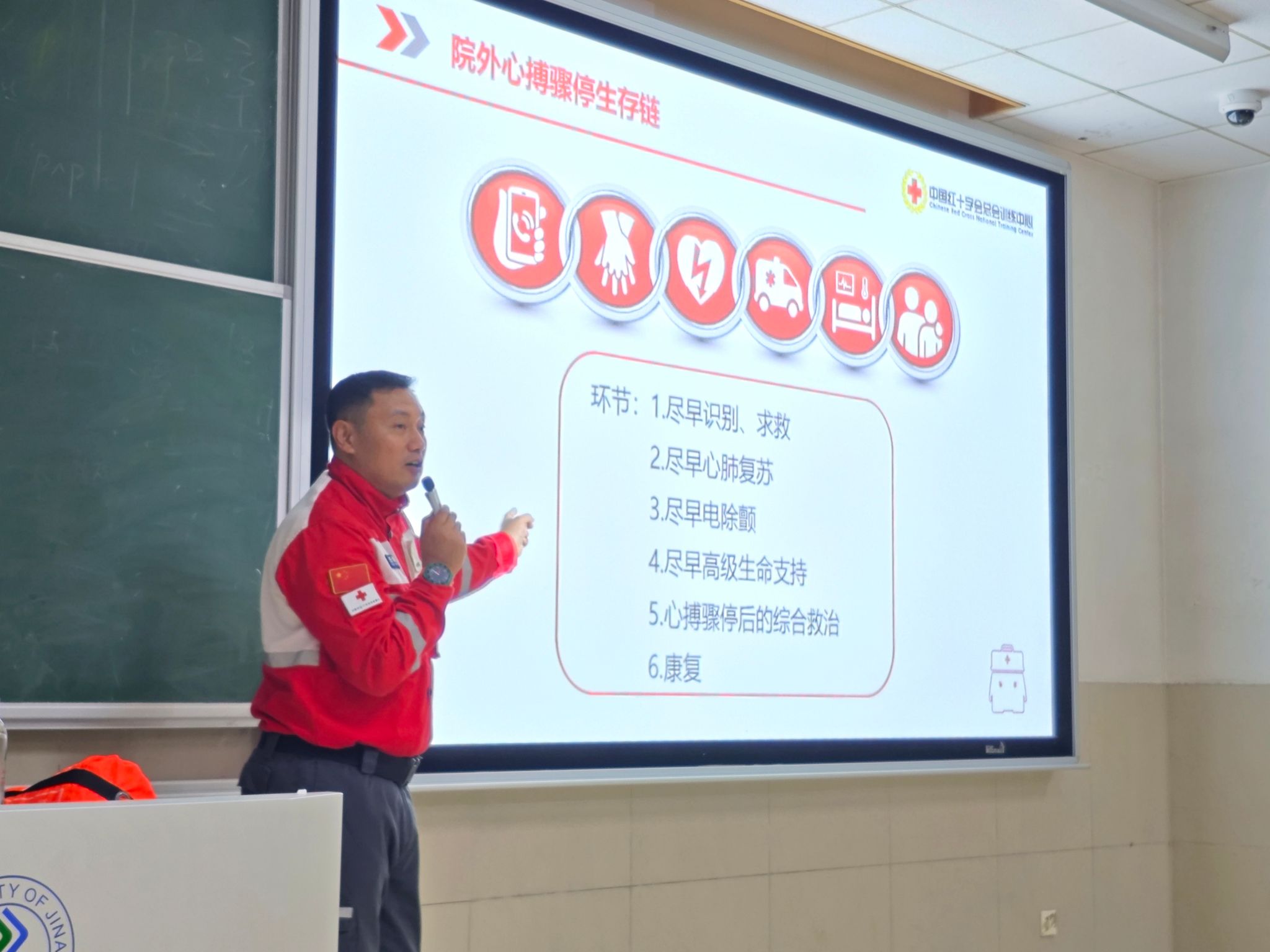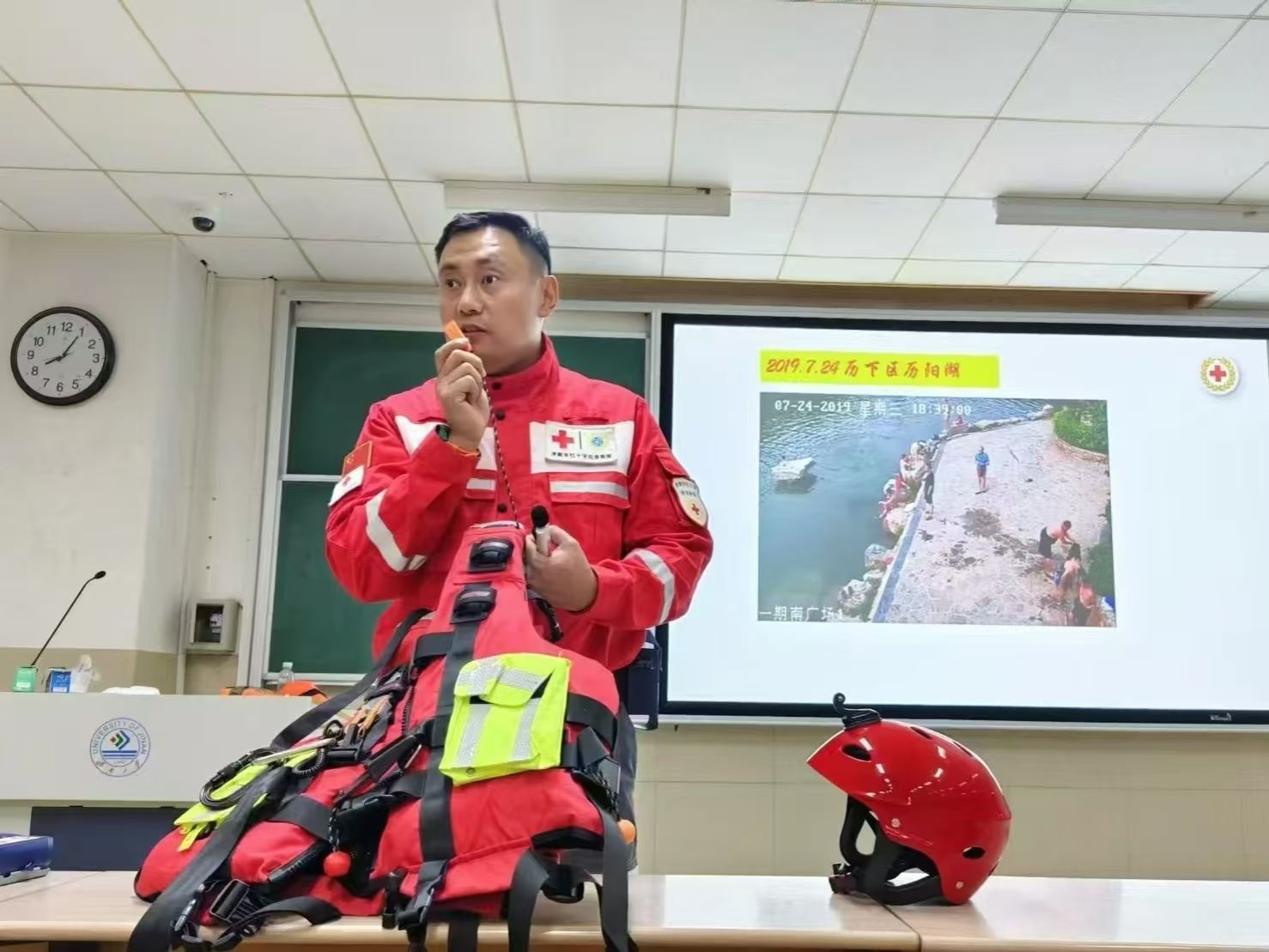 任海涛作为济南市红十字应急救援队的一员,曾多次参与全国各地特大水灾的救援工作。他从自身经验和大学生实际情况出发,对高校中近期频发的溺水、踩踏等危机事件,与同学们分享了应对措施和解决办法。同时,他建议同学们应掌握基本自救和互救技能,定期参加学校或社区组织的安全培训,提高自我防范意识和应急能力,减少校园内外的意外伤害事件。